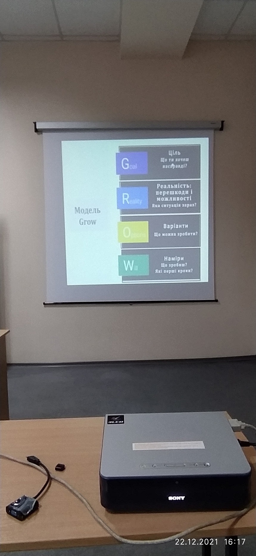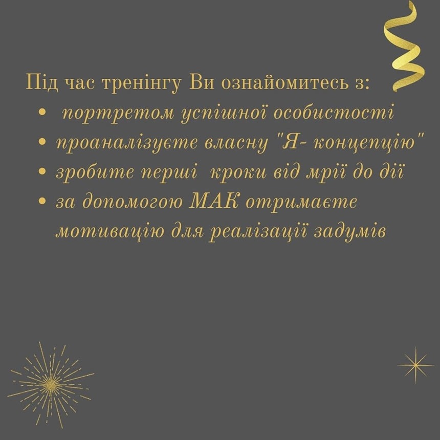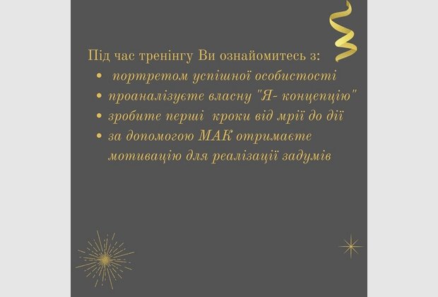 На тренінгу учасники ознайомились з портретом успішної особистості, проаналізували власну Я-концепцію. Сформували схему карту-бажань за допомогою МАК. Розглянули та на собі практично застосували постановку цілей згідно методики SMART, а також GROW. Тренінг супроводжувався якісно підібраними наочними слайдами, що сприяли засвоєнню матеріалу.