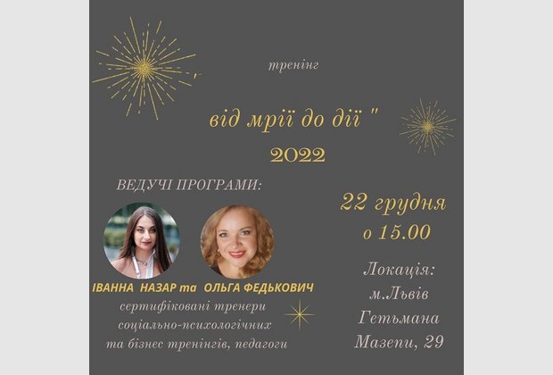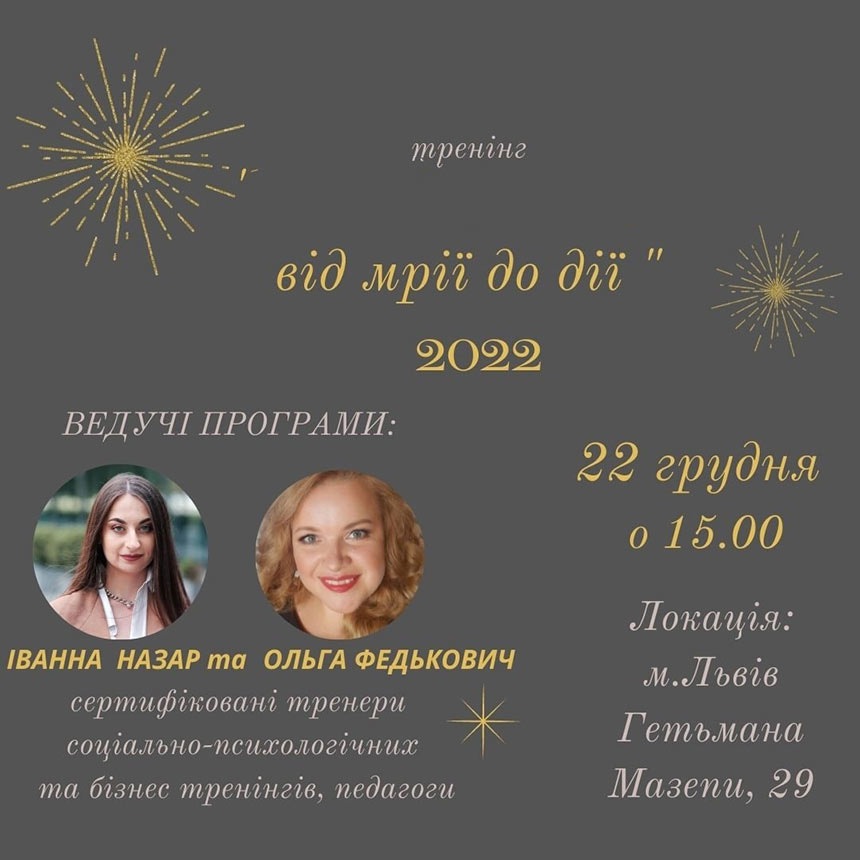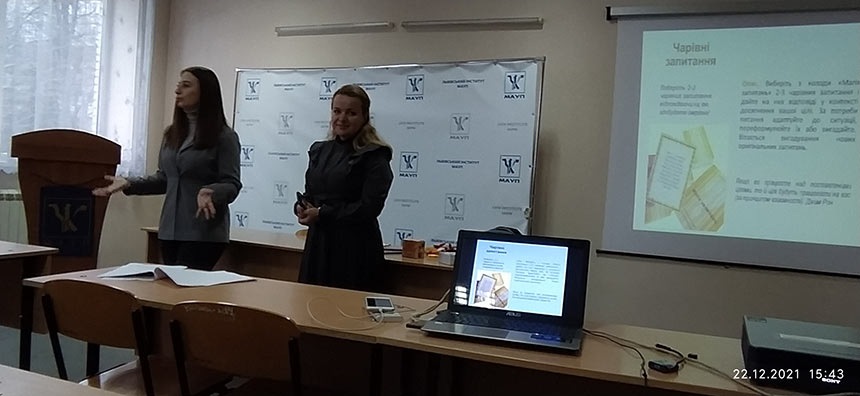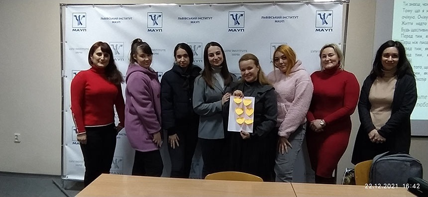 22.12.21 у Львівському інституті ПрАТ "ВНЗ "МАУП" відбулось практичне тренінгове заняття на тему: "Від мрії до дії", який провели сертифіковані тренери Ольга Федькович та Іванна Назар.