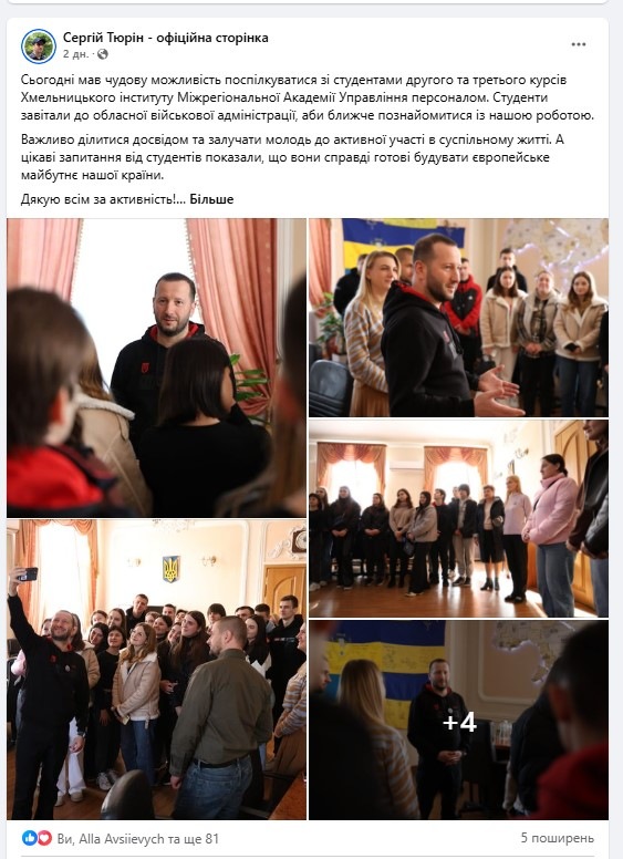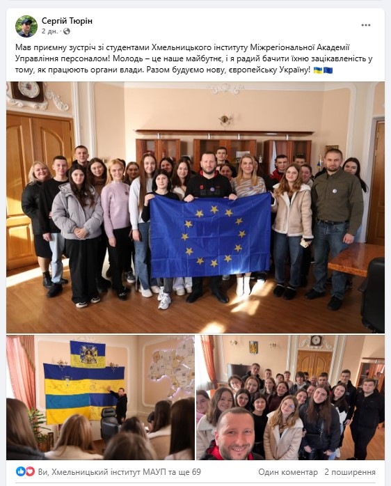 Було організовано зустріч з головою Хмельницької обласної державну (військову) адміністрації Сергієм Тюріним. Сергій Григорович поспілкувався зі студентами та поцікавився їхнім баченням європейських перспектив України.
