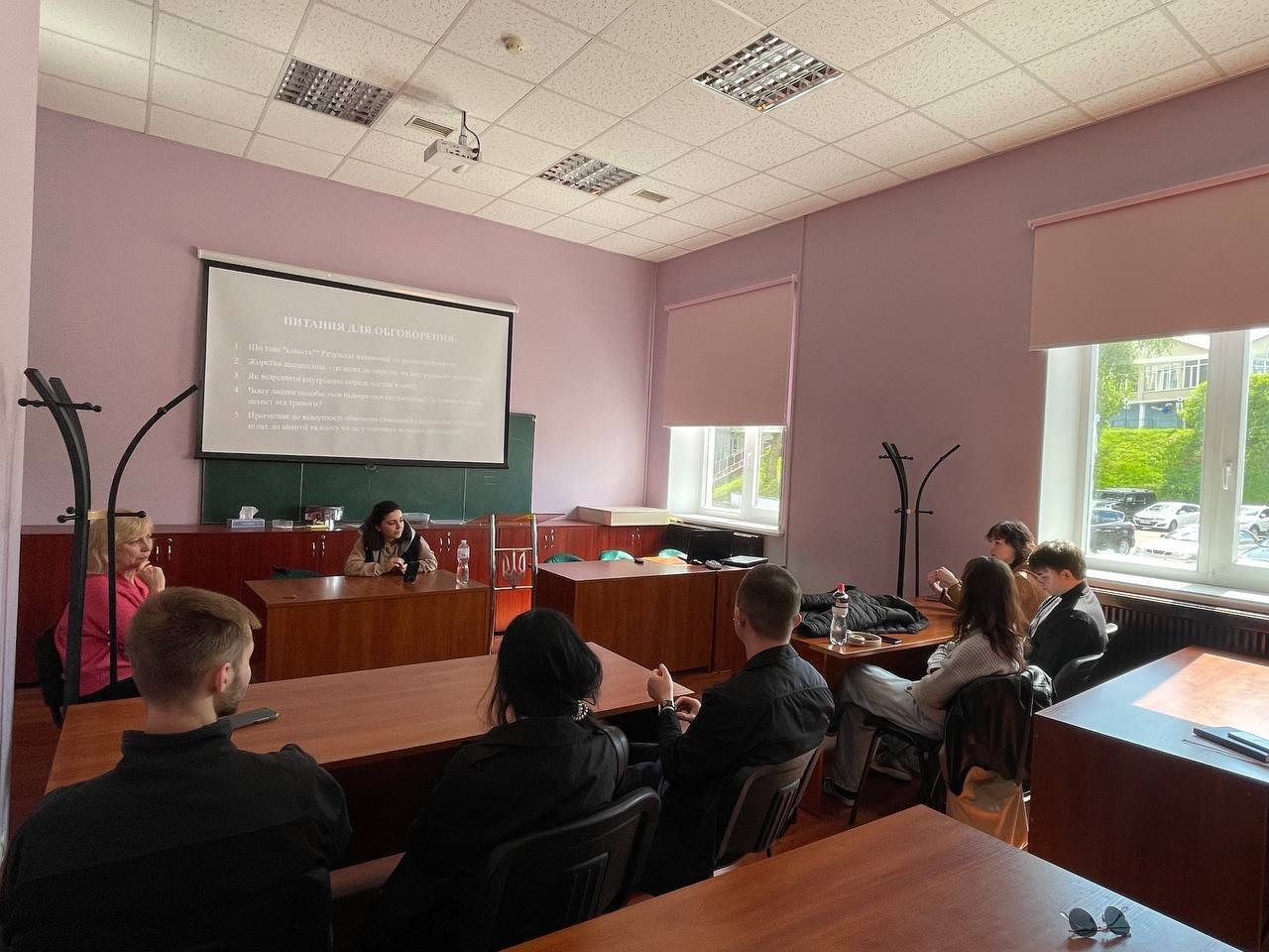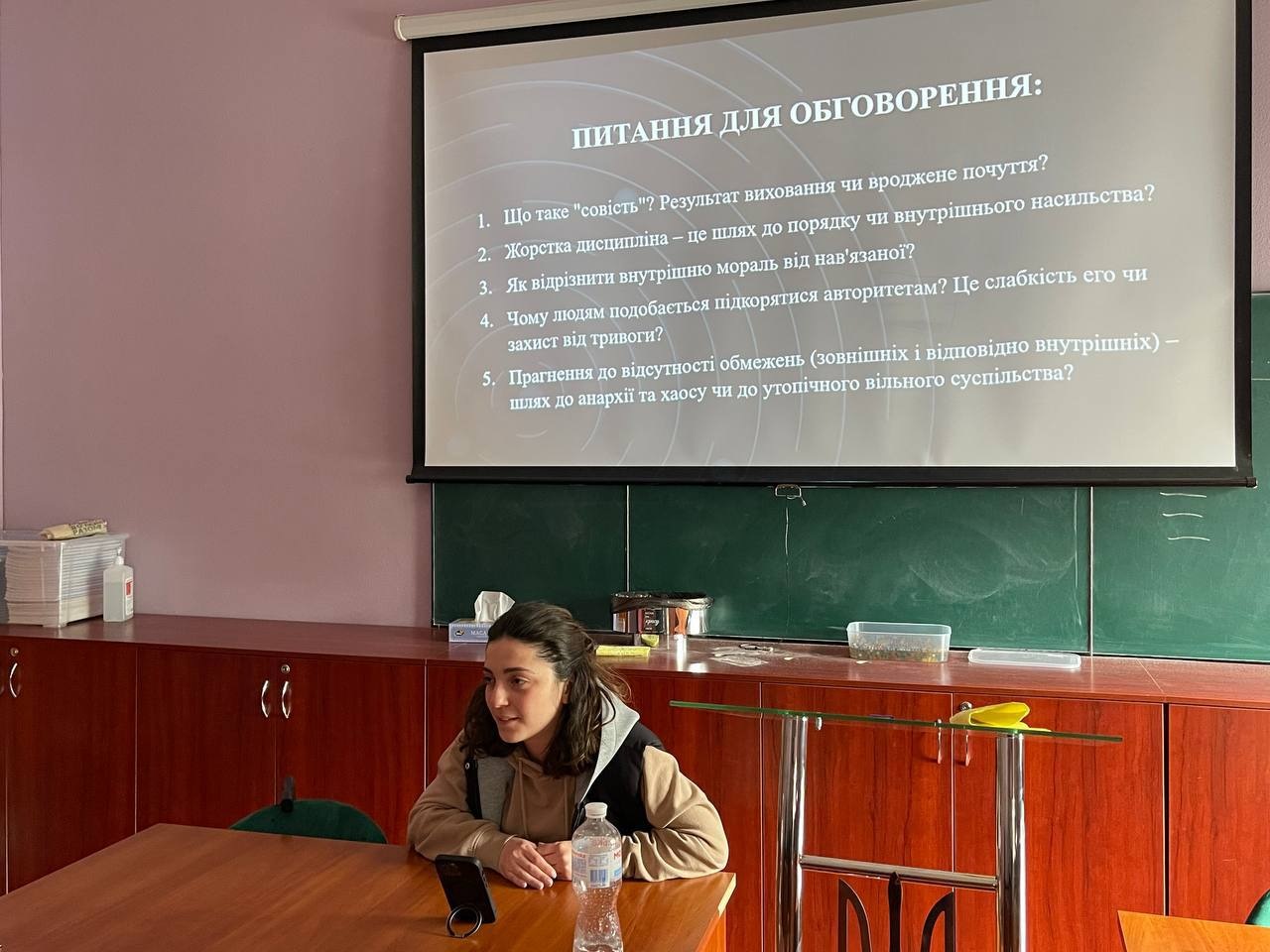 13 травня відбулось засідання гуртка на тему “Дисципліна в житті суспільства та особистості: шлях до порядку чи засіб насилля”. Модератором дискусії стала студентка спеціальності “фінанси, банківська справа та страхування” Улубян Діана і співмодератором - студент спеціальності “право” Чиж Анатолій.