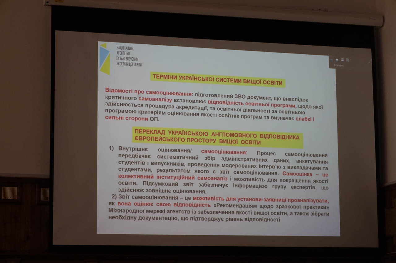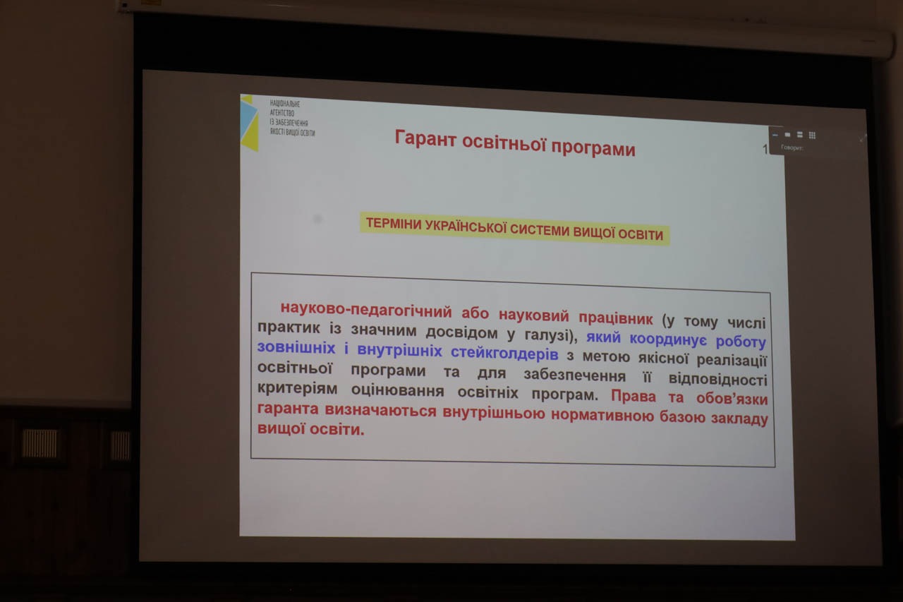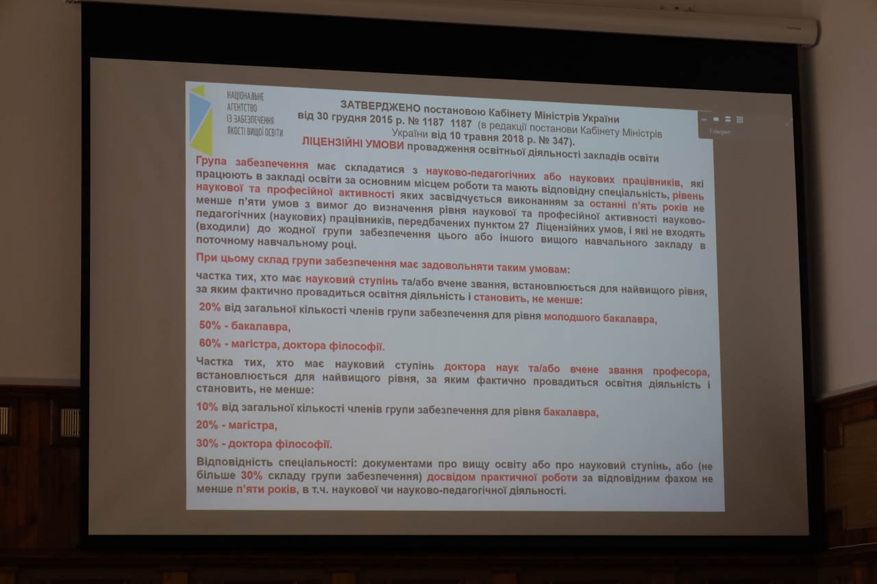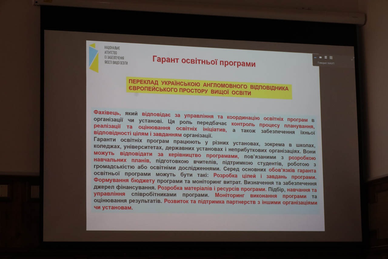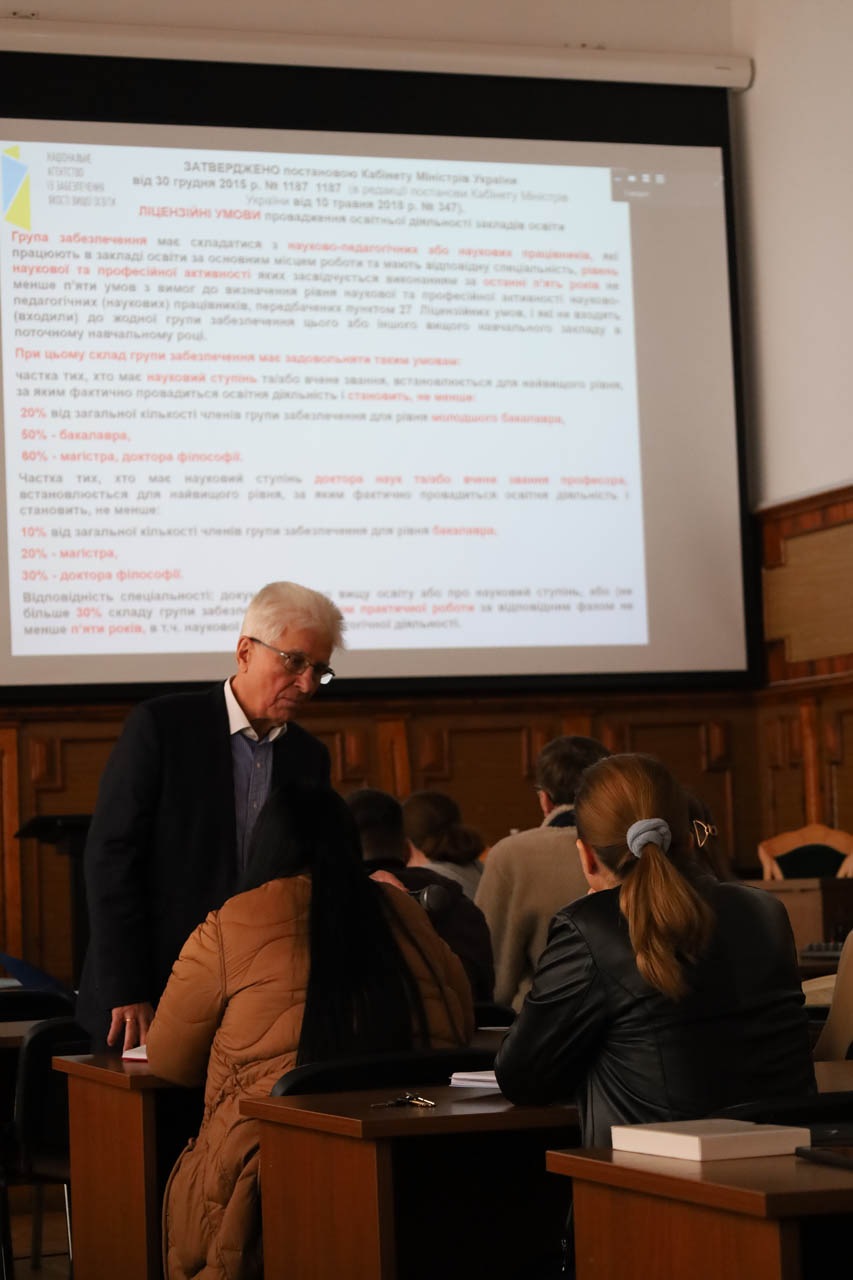 Засідання провів віце-президент Академії Михайло Гончаренко спільно із запрошеним членом Національного агентства із забезпечення якості вищої освіти (НАЗЯВО), професором Костянтином Медведєвим. У заході взяли участь 106 учасників, серед яких члени Ради, члени груп забезпечення та гаранти освітніх програм.