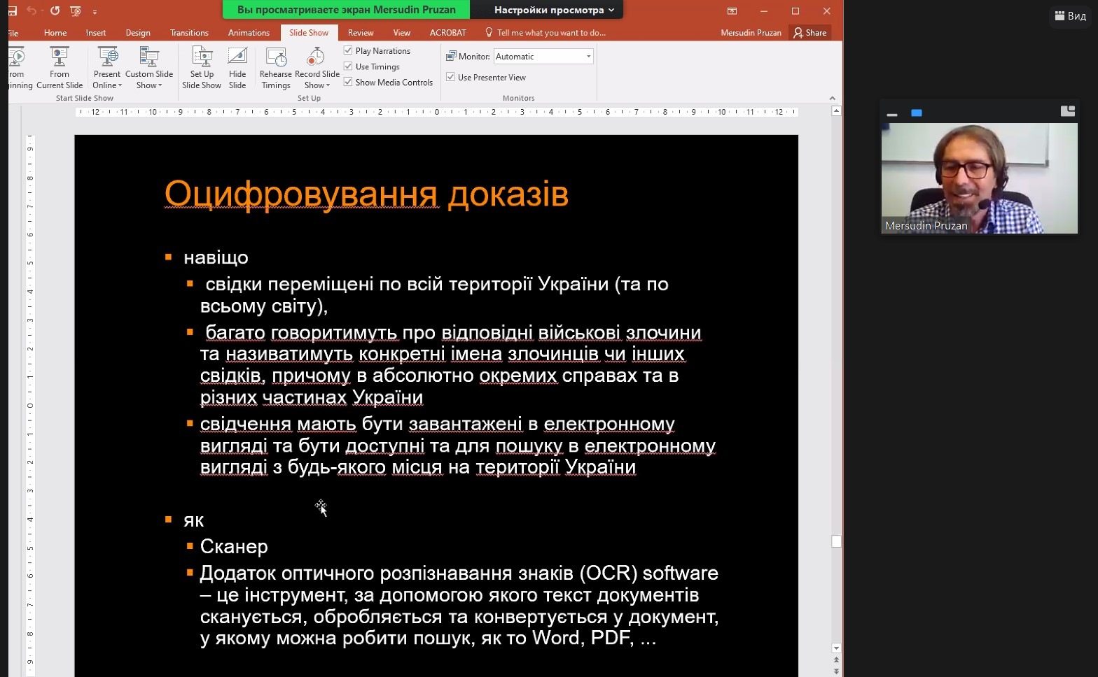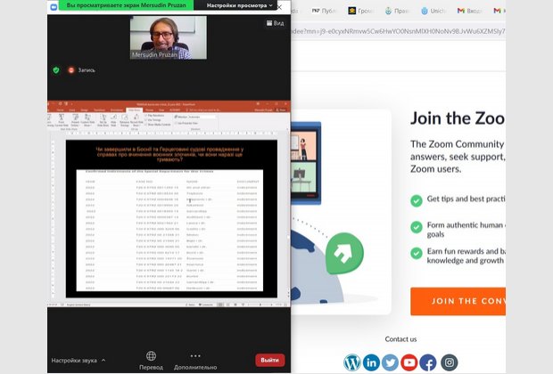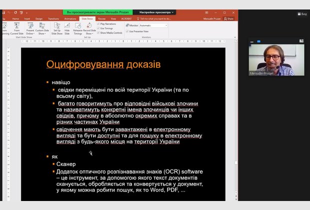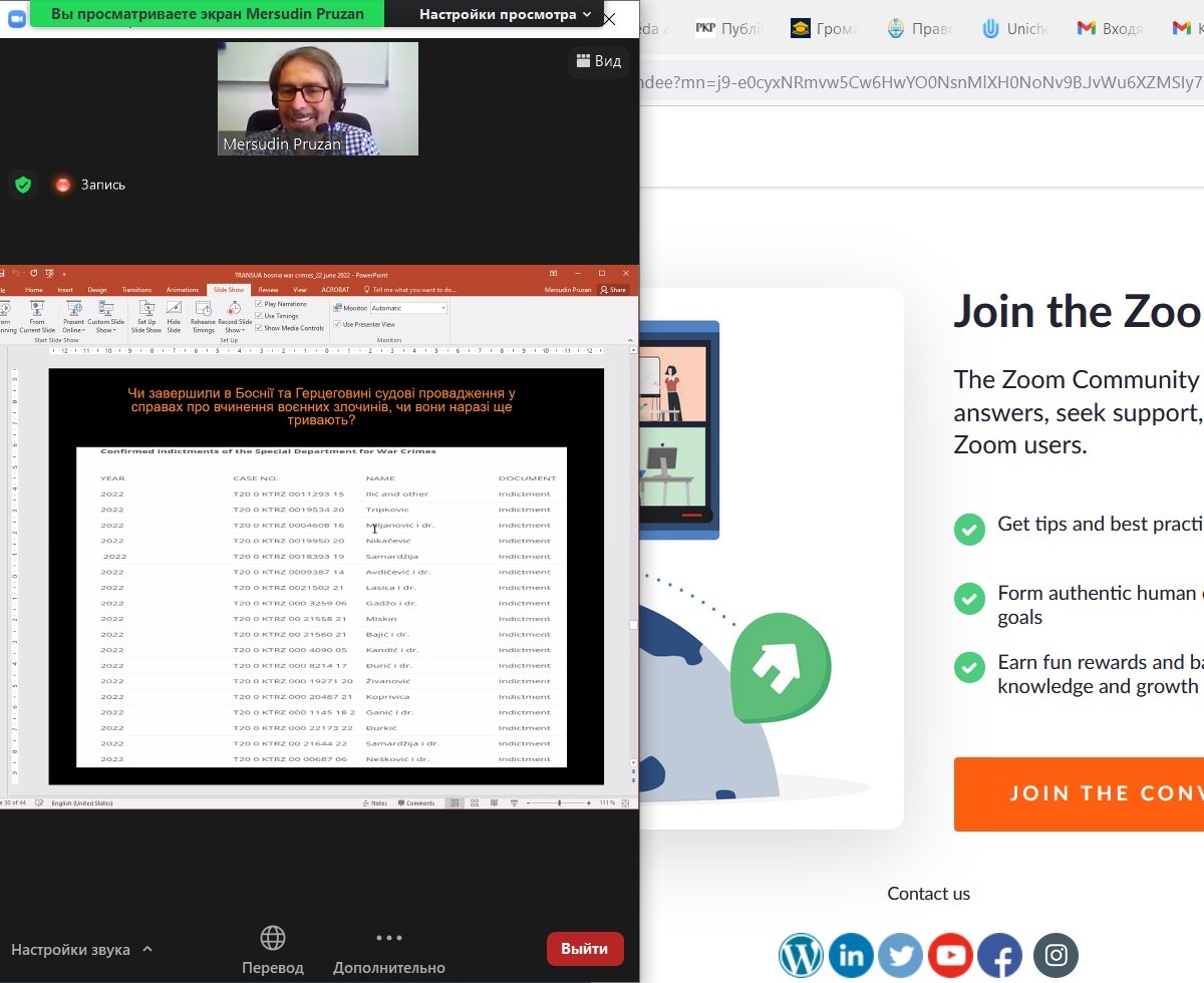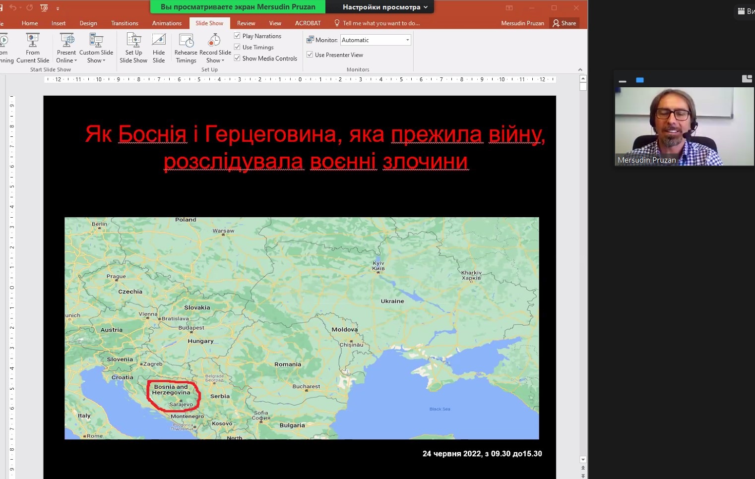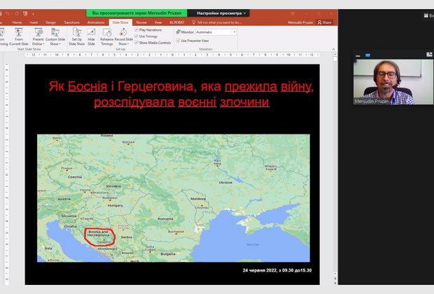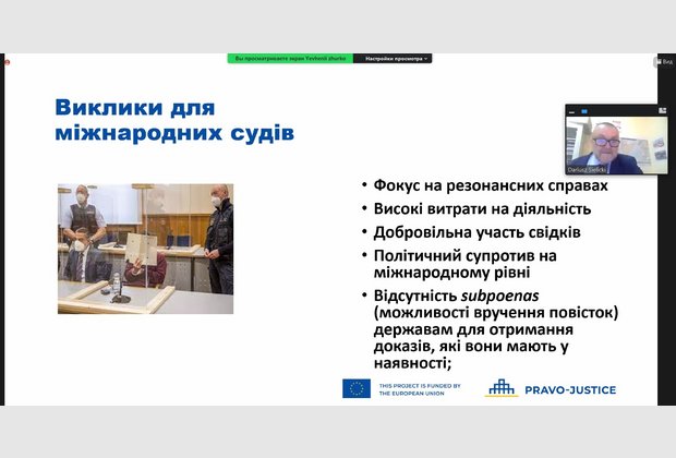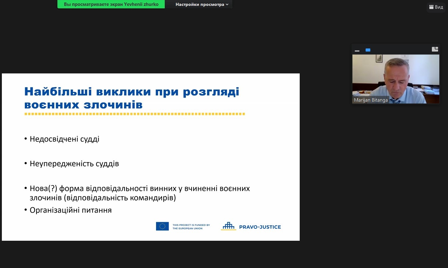 Міжнародним досвідом розгляду справ, пов’язаних з воєнним злочинами, поділилися колишній міжнародний суддя Верховного Суду Косово Даріуш Сілєцькій, прокурор департаменту воєнних злочинів Прокуратури Боснії та Герцеговини Мерсудін Пружан, суддя Вищого спеціалізованого суду з кримінальних питань Хорватії Маріян Бітанга, член Дорадчої групи з розслідування воєнних злочинів і злочинів проти людяності, колишній прокурор EULEX та спеціального трибуналу щодо Лівану Мартін Хакетт, професор права та політології юридичного факультету Університету Вандербільта Майкл Ньютон.