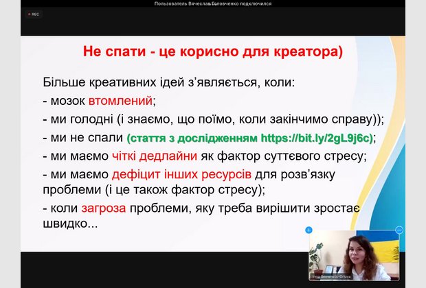 Захід відбувся у співпраці із Радою молодих вчених при МОН України та онлайн-лекторієм «Наукові зустрічі» та був надзвичайно цікавим та корисним для молодих вчених, які прагнуть інноваційного розвитку своїх м’яких навичок, бажають дізнатися про нові технології управління проєктними командами та інструменти креативності у викладанні.