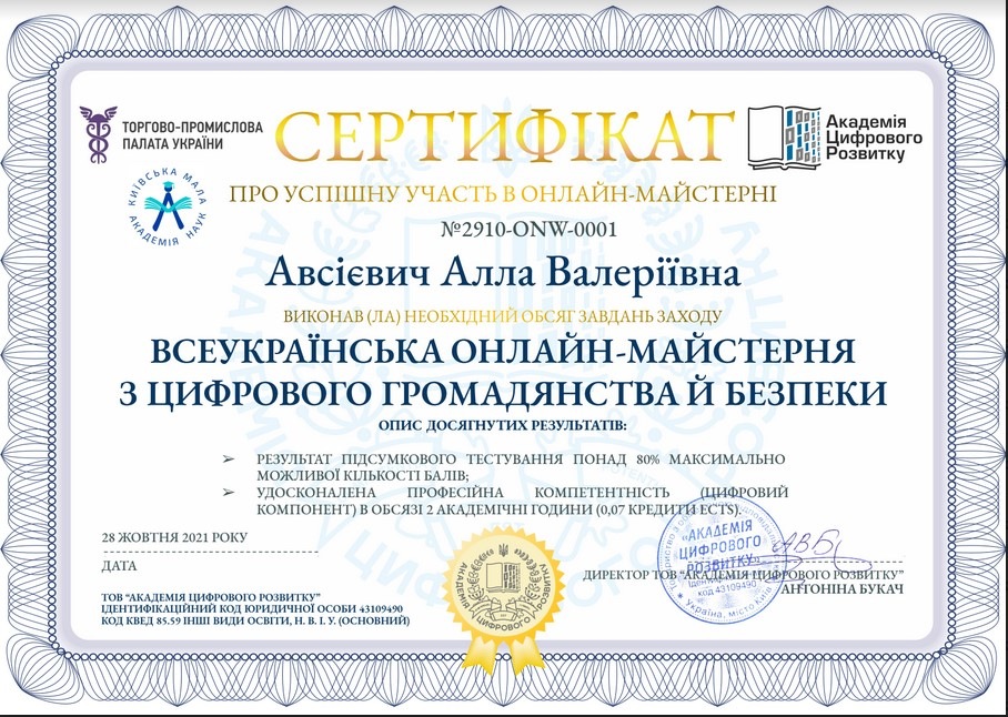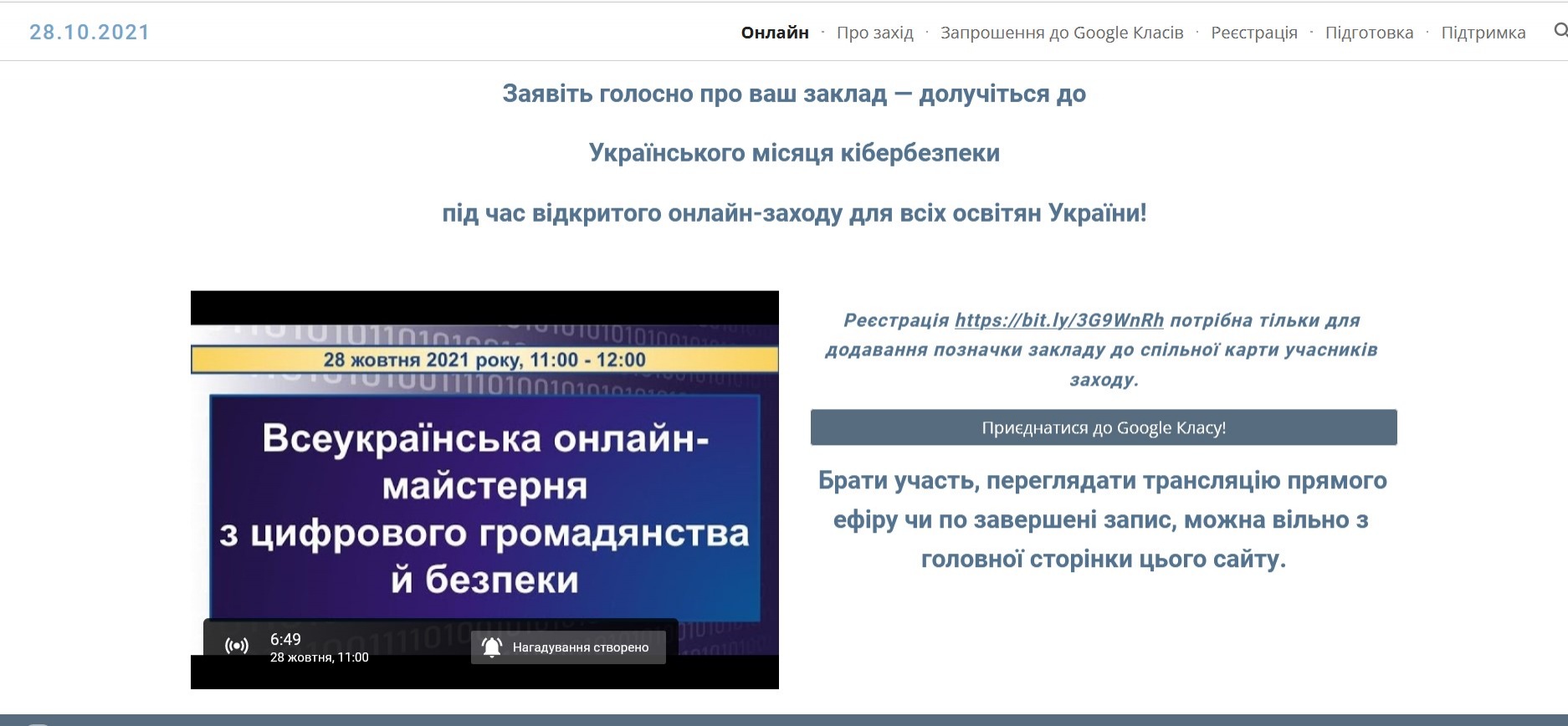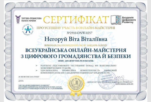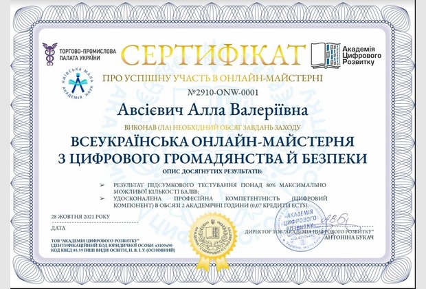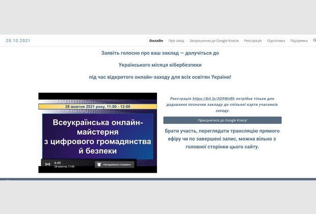 У рамках заходу «Всеукраїнська онлайн-майстерня з цифрового громадянства й безпеки» до Українського місяця кібербезпеки, 28 жовтня 2021 року був проведений відкритий онлайн-захід із трансляцією через прямий ефір YouTube для закладів освіти України.