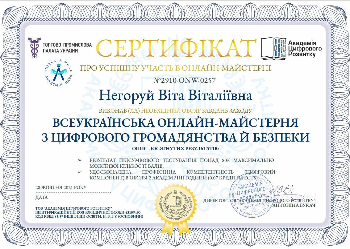 Учасники заходу Цимбалюк Ганна, Негоруй Віта та Авсієвич Алла отримали можливість виконати вправи у віртуальних кімнатах разом зі спікерами, розглянули ключові принципи мережевого етикету й безпечної поведінки, отримали рекомендації щодо обережності і відповідальності під час роботи в інтернеті, дізналися як використати готові методичні рішення для формування навичок інформаційної безпеки.