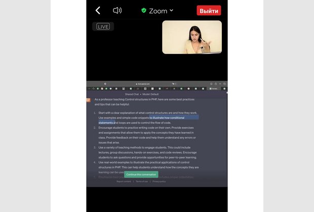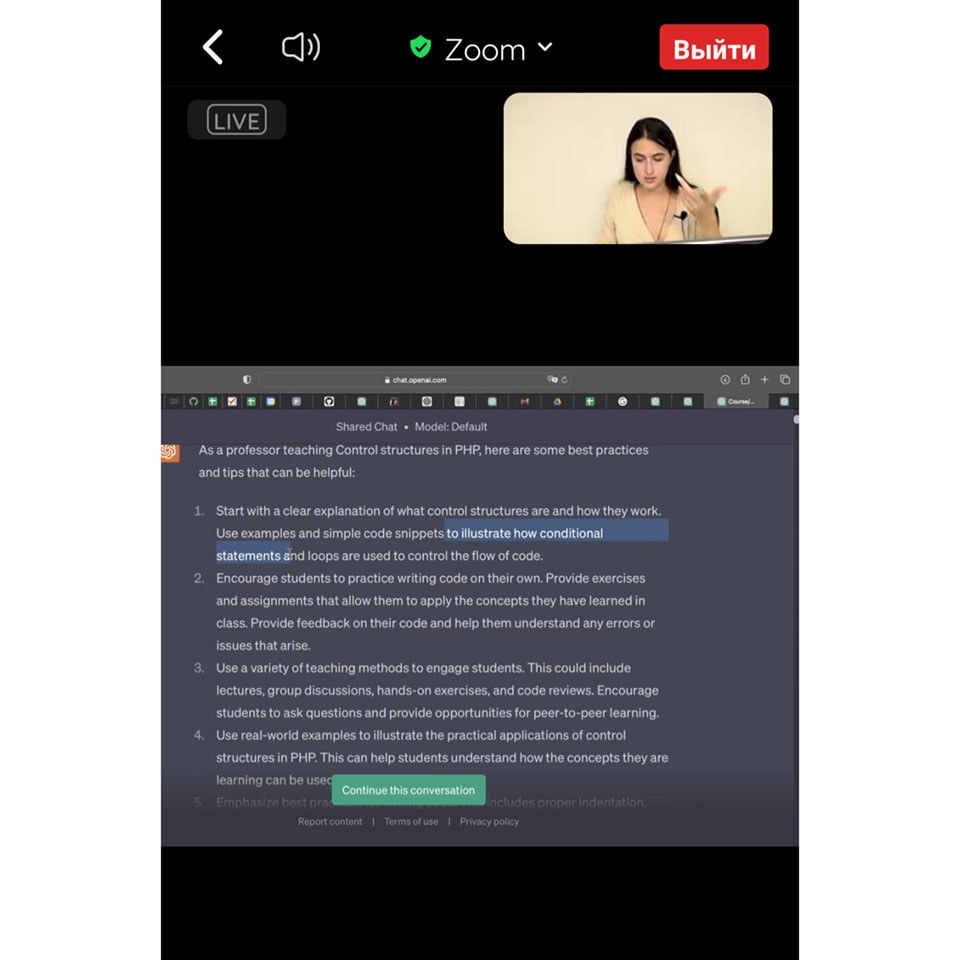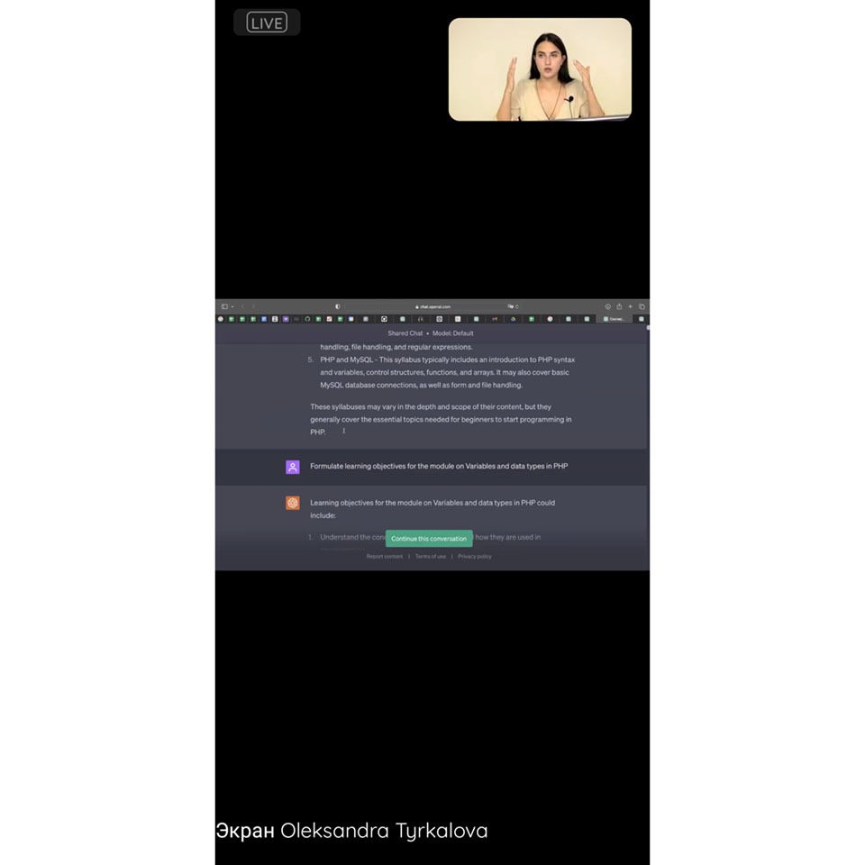 Під час обговорення на конференції Iмодератор зустрічі Олександра Тиркалова, Partnership with Universities Lead у Genesis, підготувала поглиблений матеріал щодо використання ChatGPT та поділилася своїм досвідом .