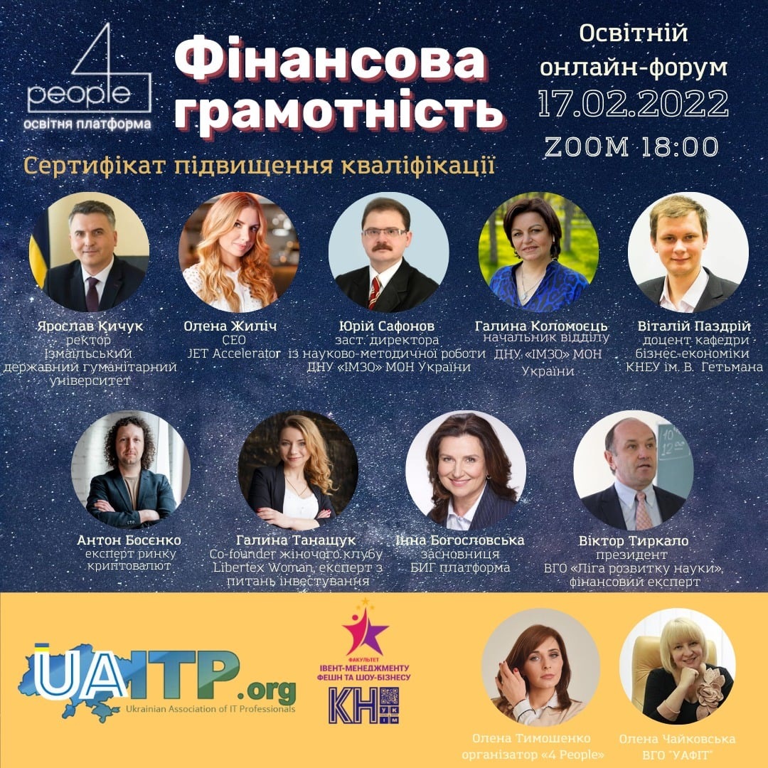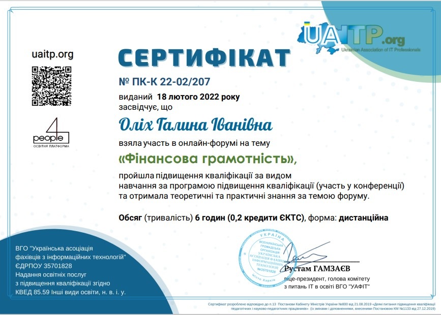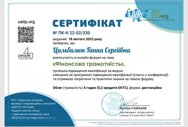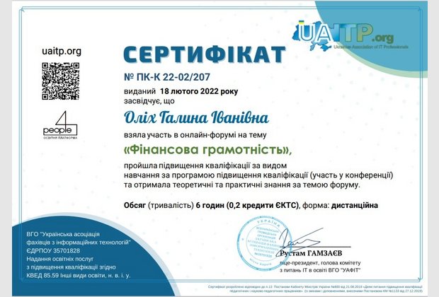 За підсумками проходження підвищення кваліфікації шляхом участі у Всеукраїнському форумі «ФІНАНСОВА ГРАМОТНІСТЬ» науково-педагогічні працівники кафедри економіки, управління та туризму Хмельницького інституту МАУП Ганна Цимбалюк та Галина Оліх отримали сертифікати.