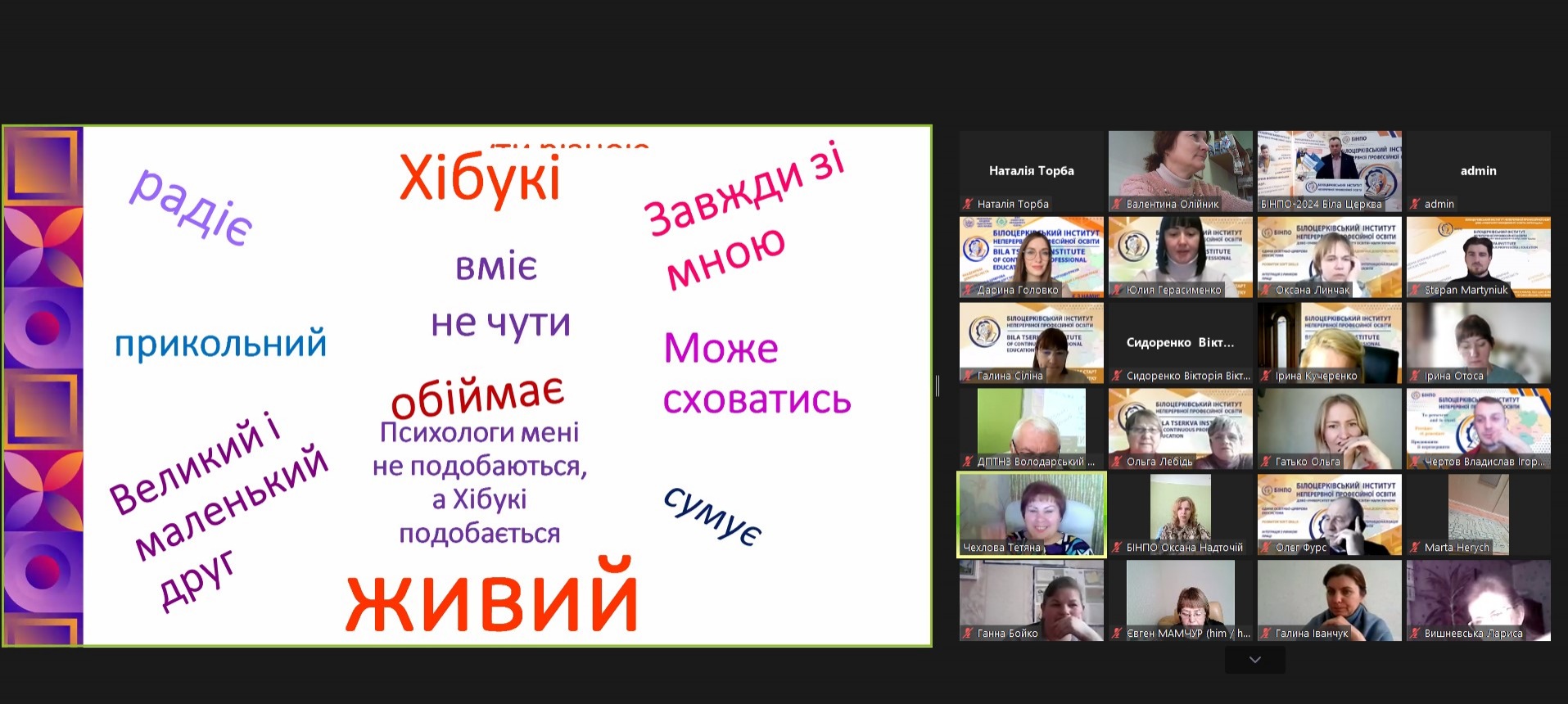 14 березня 2024 року викладачі кафедри психології Хмельницького інституту МАУП взяли участь у «Калейдоскопі психологічних практик», приурочений до 45-річчя з дня заснування Білоцерківського інституту неперервної професійної освіти.