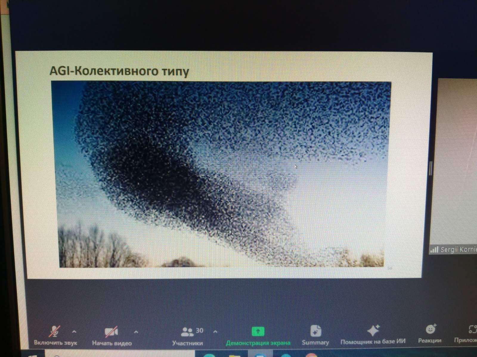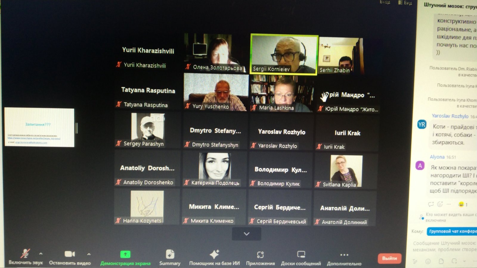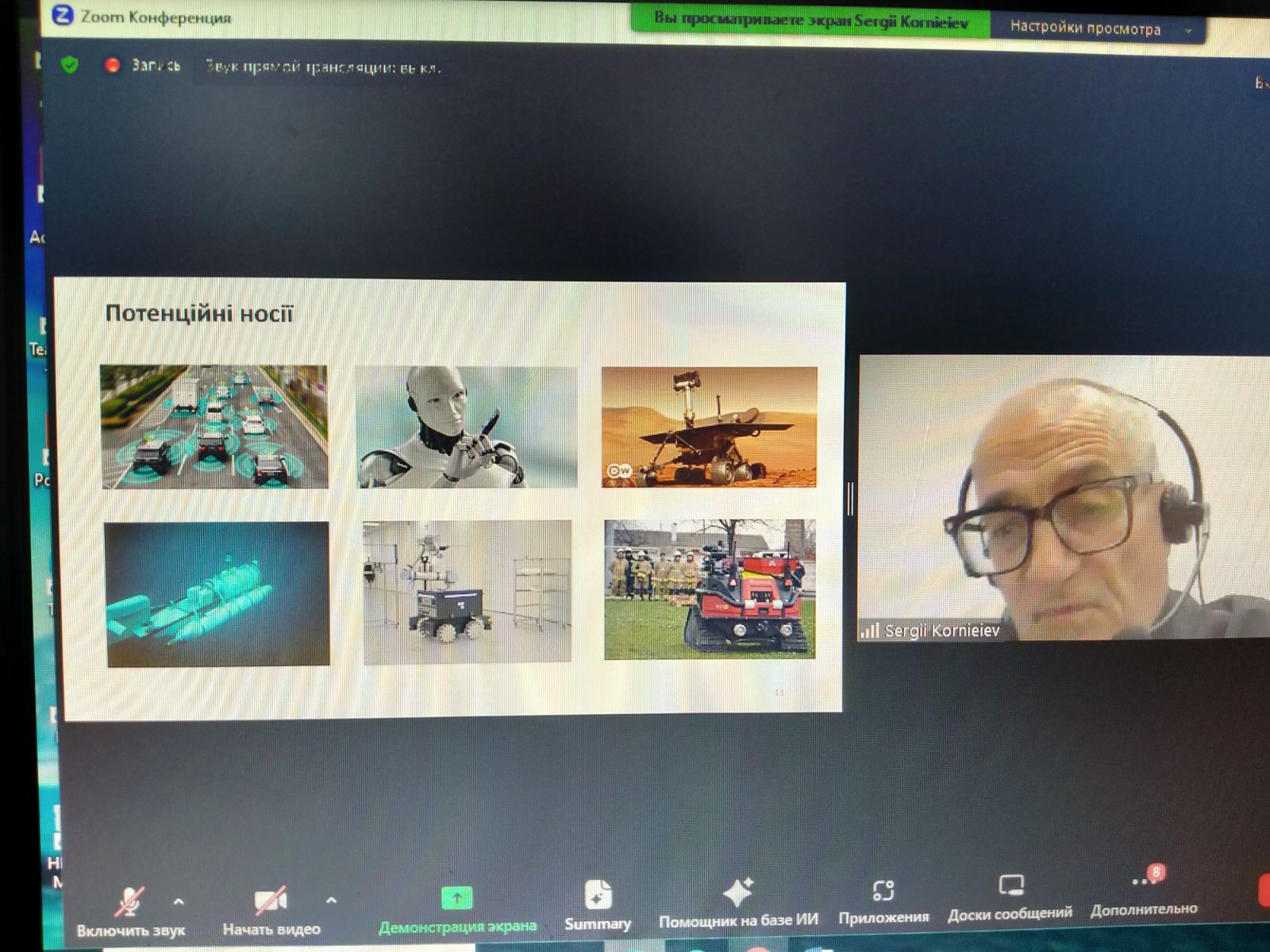 Проблема штучного інтелекту вивчається з моменту появи комп'ютера, але розвиток наукових досліджень ШІ відбувся з початку 90-х років ХХ століття. С. Корнєєв займається проблемами ШІ з 1984 року, він поділився з учасниками наукової зустрічі результатами своїх досліджень в галузі інтелектуального та колективного інтелекту. Лектор вважає, що роботи насамперед потрібні там, де людина не спроможна існувати (космос, океан). Є проблема контролю ШІ з етичної точки зору.