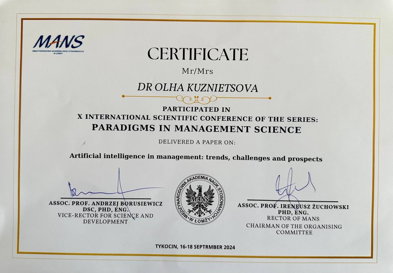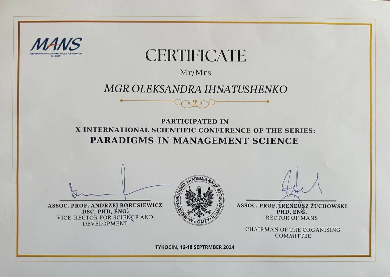 З 16 по 18 вересня 2024р. викладачі Одеського інституту ПрАТ «ВНЗ «МАУП» взяли участь у 10-й Міжнародній науковій конференції "Парадигми в управлінських науках" у м. Тикоцін (Польща), організованій Міжнародною Академією Прикладних Наук у Ломжі (MANS w Łomży).