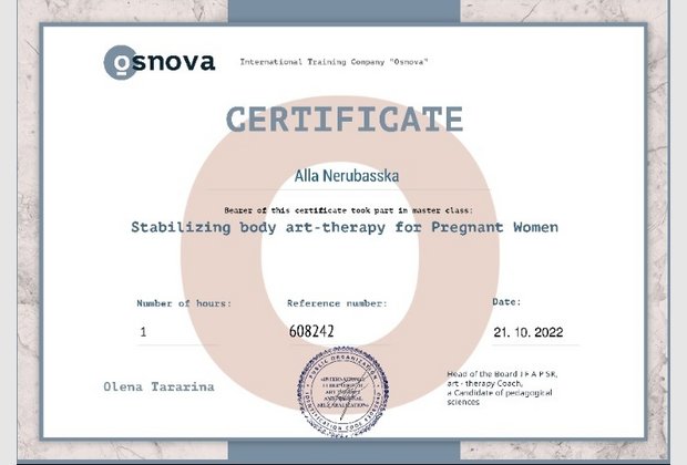 Доктор філософських наук, доцент, зав.кафедри загальнонаукових, соціальних та поведінкових дисциплін Одеського інституту МАУП, арт-терапевт Алла Нерубасська взяла участь а Майстер-класі "Тілесна стабілізаційна арт-терапія для вагітних", проведеному Міжнародною тренінговою компанією "Основа".