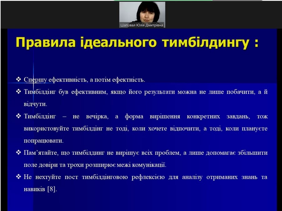 Упровадження технологій тимбілдингу як ефективної форми згуртування студентської спільноти ЗФПО (Шаповал Юлія Дмитрівна канд. пед. наук, спеціаліст вищої категорії, викладач- методист Балаклійського педагогічного фахового коледжу КЗ «Харківська гуманітарно-педагогічна академія» ХОР)