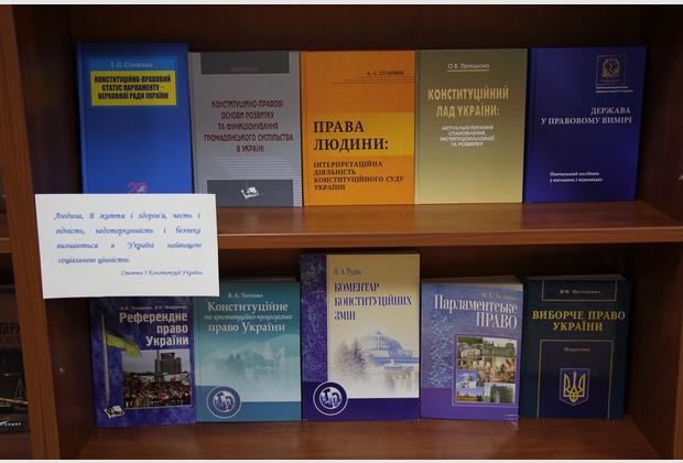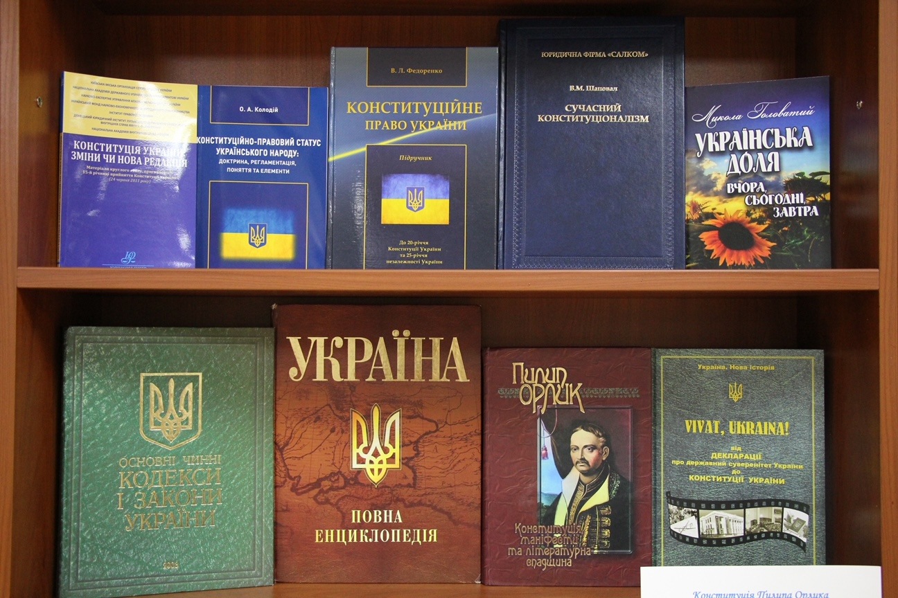 Серед літератури, яка експонується на виставці, зверніть увагу на такі книги: «Конституція, маніфести та літературна спадщина», «Правова держава: історія, теорія, методологія», «Конституційно-правові основи розвитку та функціонування громадського суспільства в Україні», «Державність та право України» та інші.