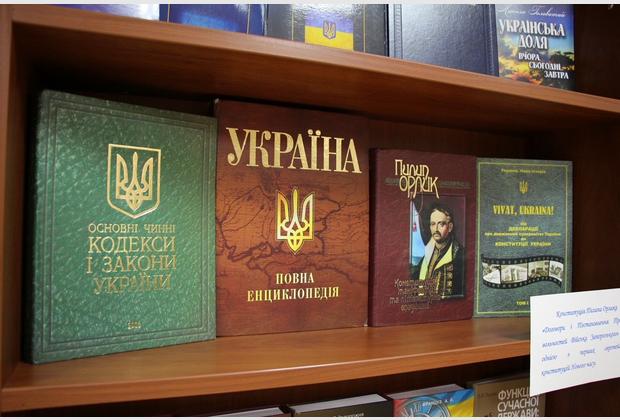 На виставці представлена література, яка формує правову культуру та відображає найважливіші історичні моменти конституційного процесу на складному і довгому шляху державотворення України.