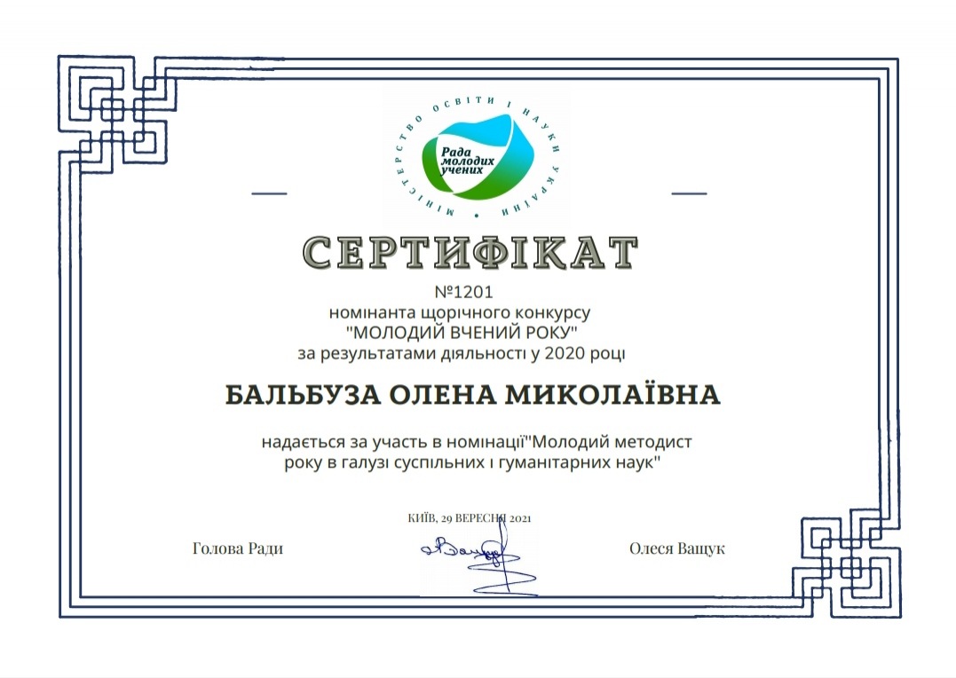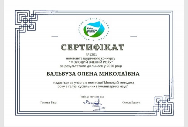 Вітаємо викладача Одеського інституту МАУП Бальбузу Олену Миколаївну - доктора філософії в галузі психології, практичного психолога з отриманням Сертифікату «Молодий методист року в галузі суспільних і гуманітарних наук».