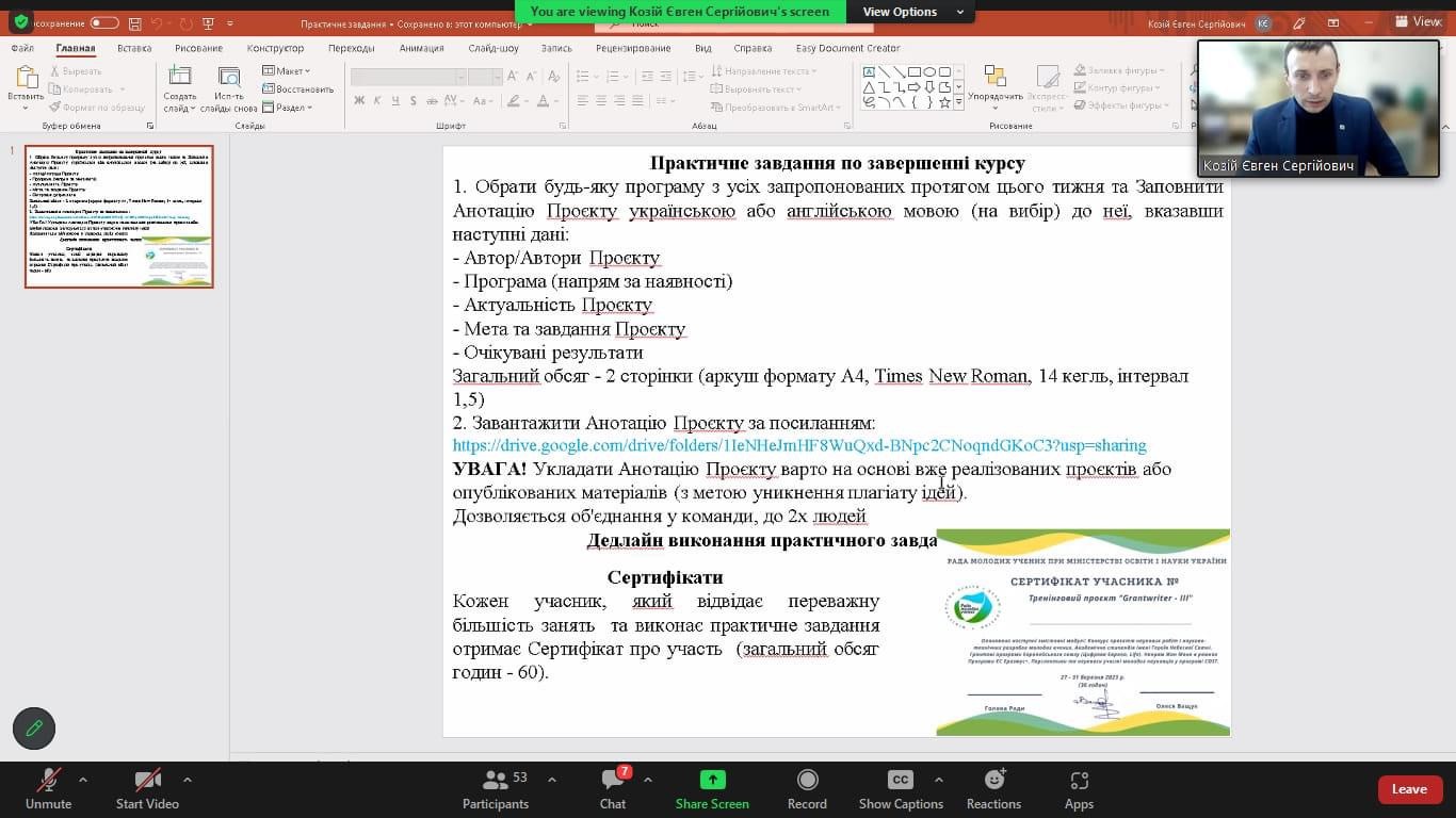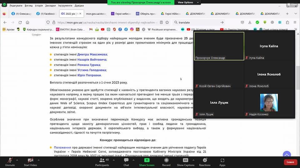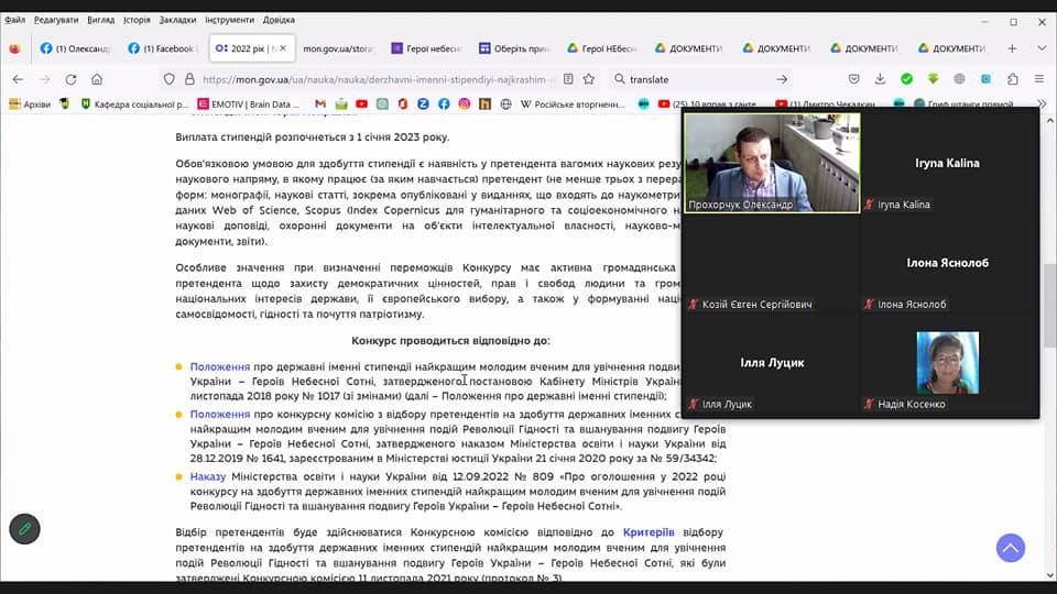 Викладачі Навчально-наукового інституту управління, економіки та бізнесу продовжили прослуховування тренінгового проєкту "Grantwriter-ІІІ". Тематика тренінгу: "Академічна стипендія імені Героїв Небесної Сотні". Розглянули загальну структуру заявки та поради щодо її заповнення.