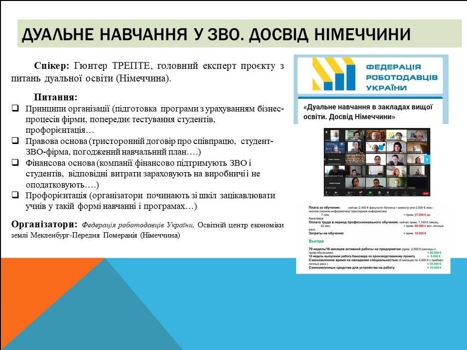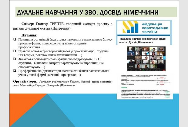 Під час вебінару були розглянуті питання та прикладі кейси організації дуального навчання: