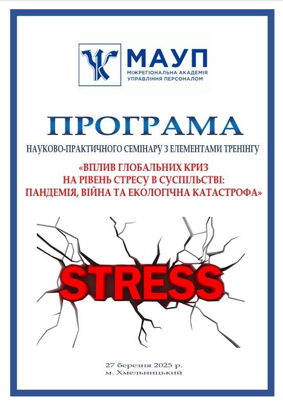 27 березня 2025 року викладачі кафедри психології Хмельницького інституту МАУП провели для студентів-психологів бакалаврату 1-4 курсів і магістратури 1 курсу денної форми навчання науково-практичний семінар з елементами тренінгу «Вплив глобальних криз на рівень стресу в суспільстві: пандемія, війна та екологічна катастрофа».