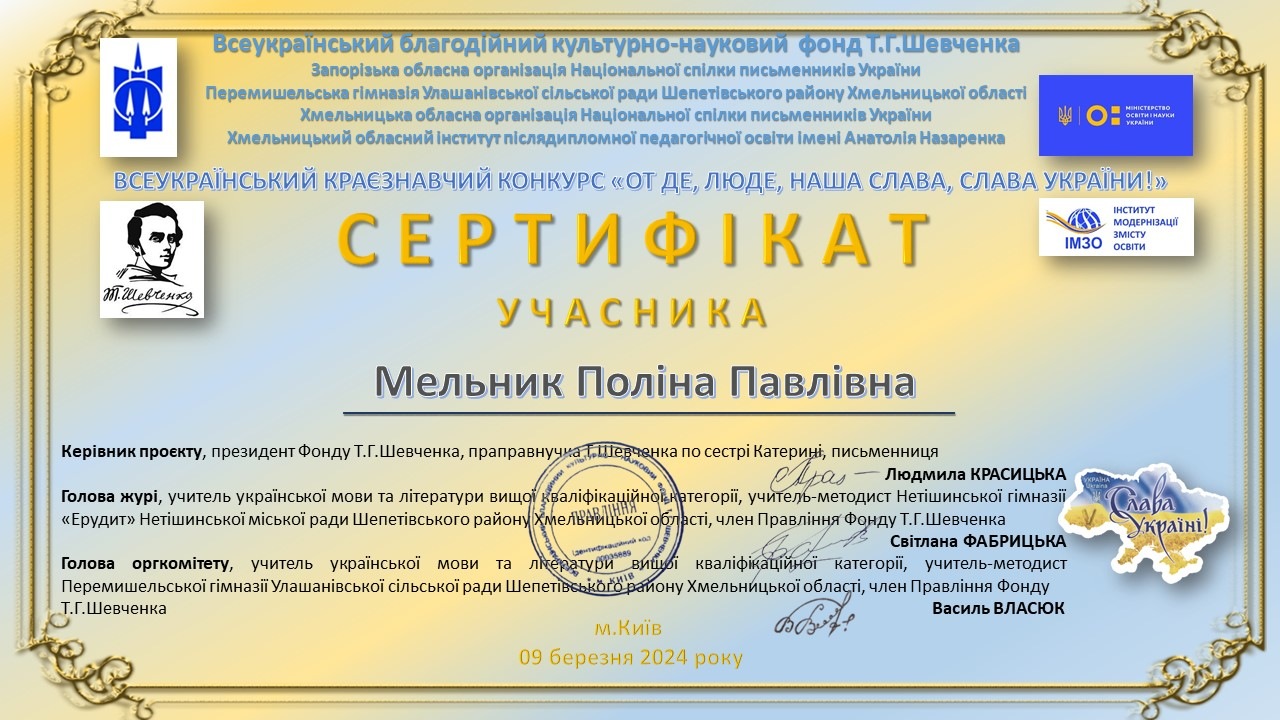 Студенти Софія Войцехівська, Поліна Мельник Хмельницького економіко-правового фахового коледжу МАУП та Юлія Шаргун Хмельницького інституту МАУП взяли участь у Всеукраїнському краєзнавчому конкурсі «От де, люде, наша слава, слава України».