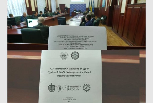 Викладачі ФКІТ спільно зі студентами старших курсів прийняли участь в Міжнародній науково-практичній конференції WS on Cyber Hygiene & Conflict Management in Global Inform, що проходила 29.11.19 -30.11.19 в Національному Авіаційному університеті ( Кібергігієна і управління конфліктами в кіберпросторі – це перший побідний захід в Україні).Сесію відкрив Ректор НАУ професор Володимир Ісаєнко , далі виступили перший проектор НАУ, голова оргкомітету Валерій Козловський, Тамара Радівілова, Олександр Оксіюк з КНУ ім. Тараса Шевченка, докторант НАУ Татьяна Охрименко, представники стейкхолдерів Олег Полигенько і Олексій Паденко з кіберполіції.