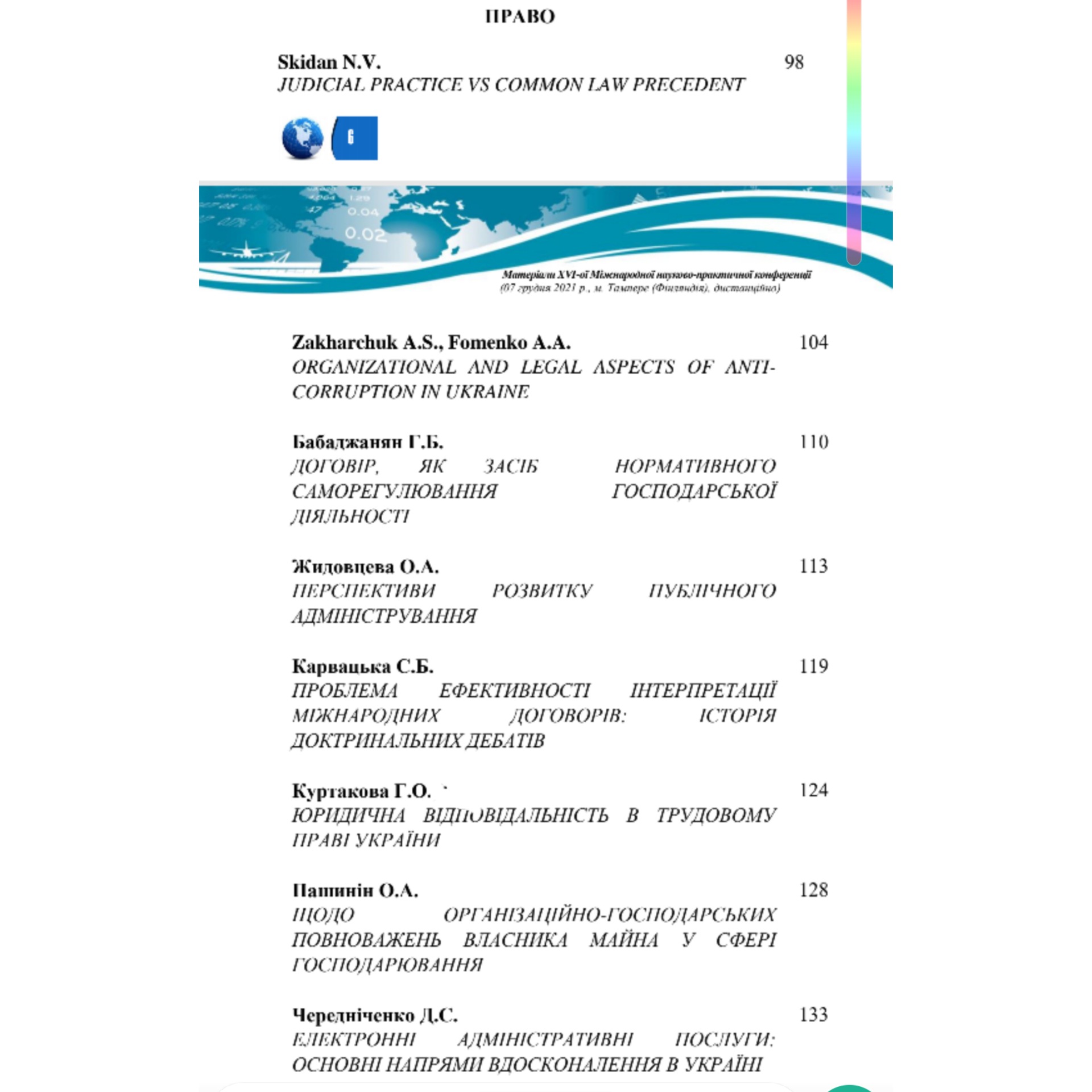 7 грудня 2021 року у місті Тампере (Фінляндія) відбулася XVI Міжнародна науково-практична конференція «Сучасні аспекти модернізації науки: стан, проблеми, тенденції розвитку» у рамках Видавничої групи «Наукові перспективи». Доповідачами на онлайн-конференції виступили викладачі та студенти кафедри цивільно-правових дисциплін та міжнародного права Навчально-наукового інституту права імені князя Володимира Великого ПрАТ «ВНЗ «МАУП».