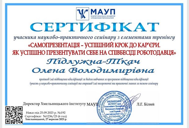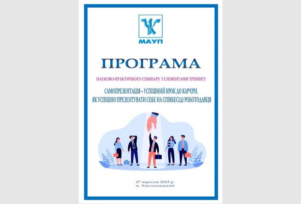 27 вересня 2023 року у Хмельницькому інституті МАУП для студентів-психологів 2-4 курсів бакалаврату проведено науково-практичний семінар з елементами тренінгу «Самопрезентація – успішний крок до кар’єри. Як успішно презентувати себе на співбесіді роботодавця».