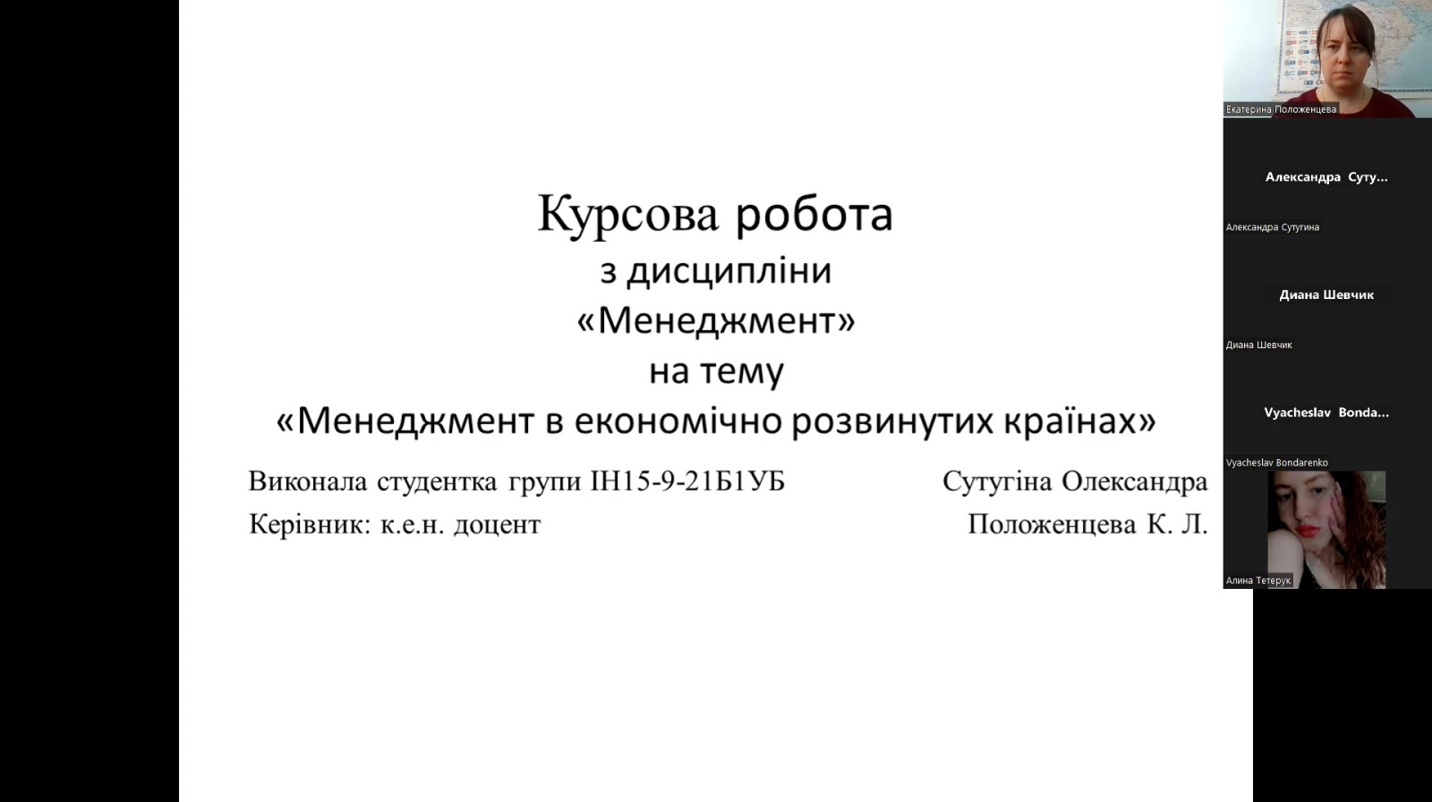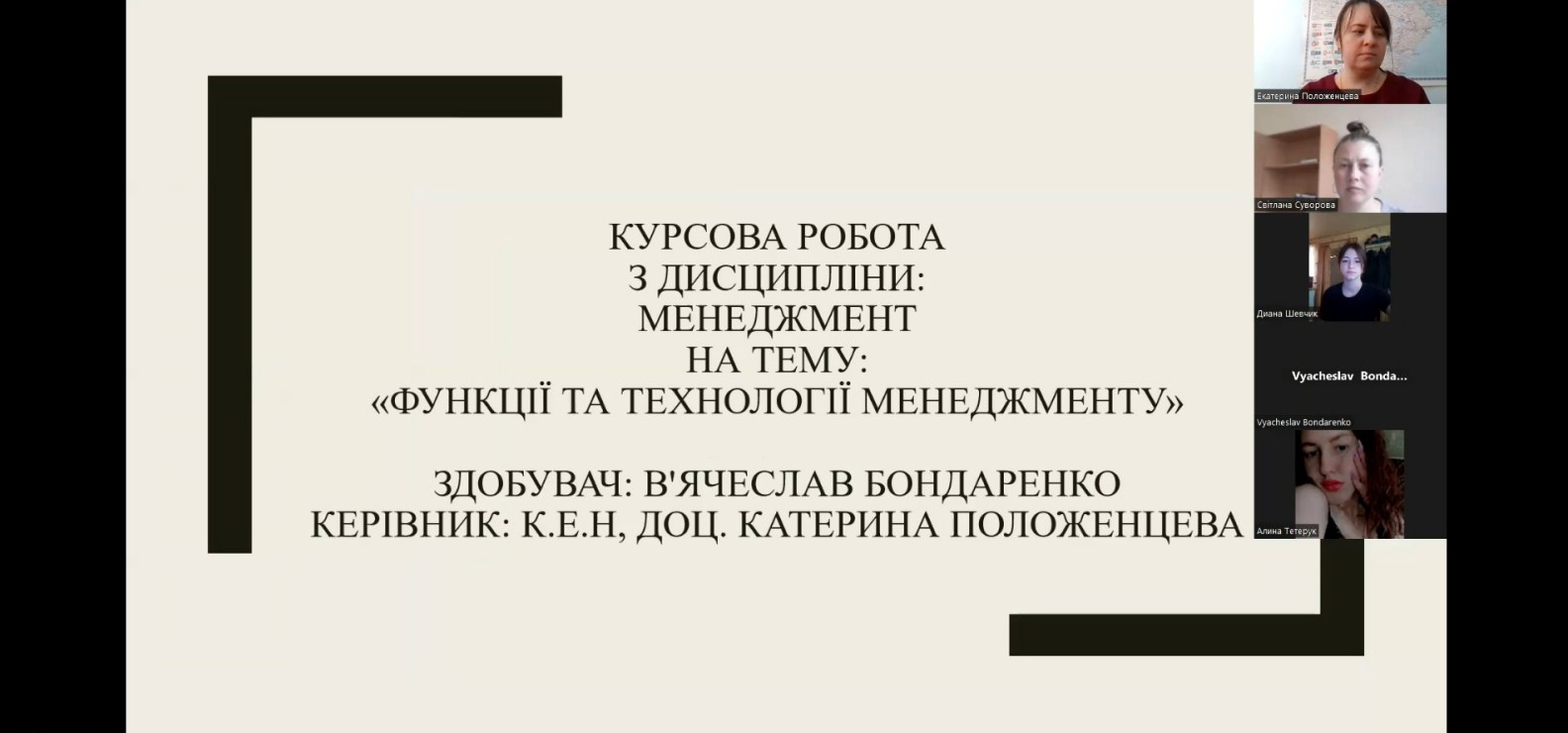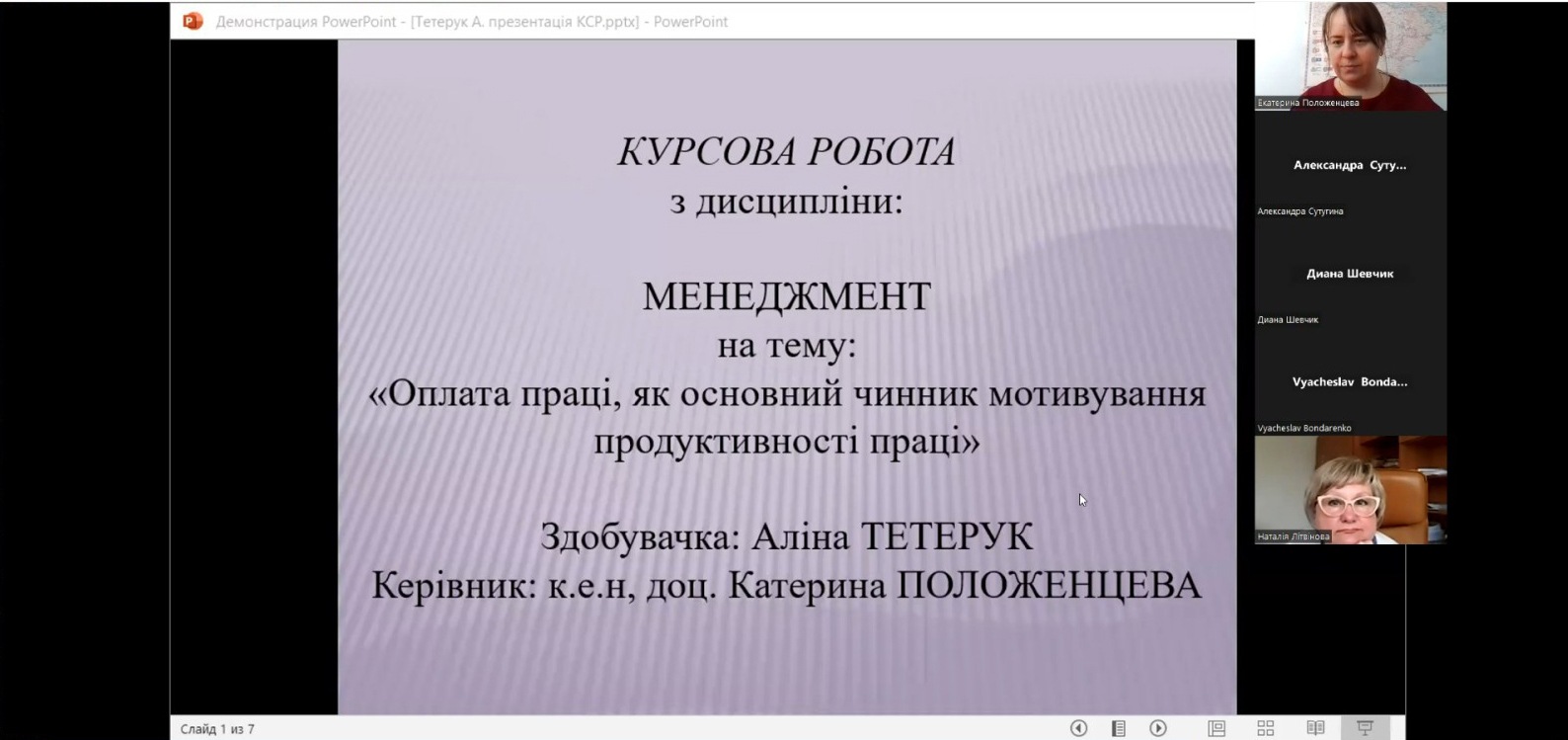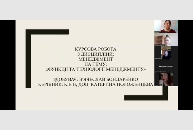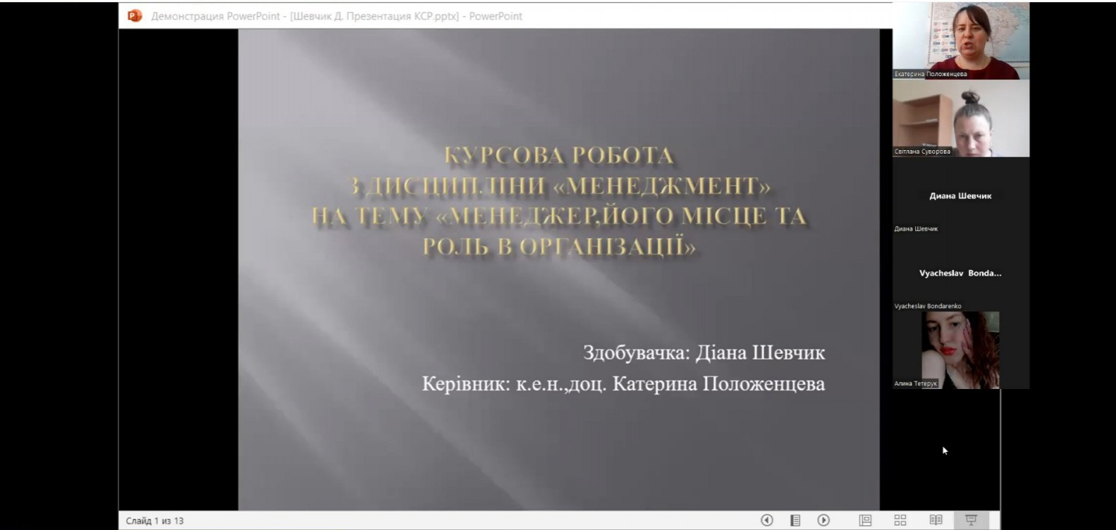 Вітаємо здобувачів 2 курсу спеціальності «менеджмент» спеціалізації «управління бізнесом» з успішним захистом курсових робіт з дисципліни «менеджмент». Комісією в складі директора Північноукраїнського інституту МАУП Наталії Літвінової, завідувача кафедри УПЕППУ Світлани Суворової та викладача дисципліни доцента Катерини Положенцевої було прийнято захист робіт в режимі «онлайн» з використанням платформи ZOOM. По кожній роботі було підготовлено презентації за допомогою сучасних мультимедійних сервісів. Комісія відмітила, що, незважаючи на складну ситуацію в країні, здобувачі показали високий рівень підготовки. Захист проведено на високому технічному рівні, а результати курсових робіт є перспективними для подальших досліджень.