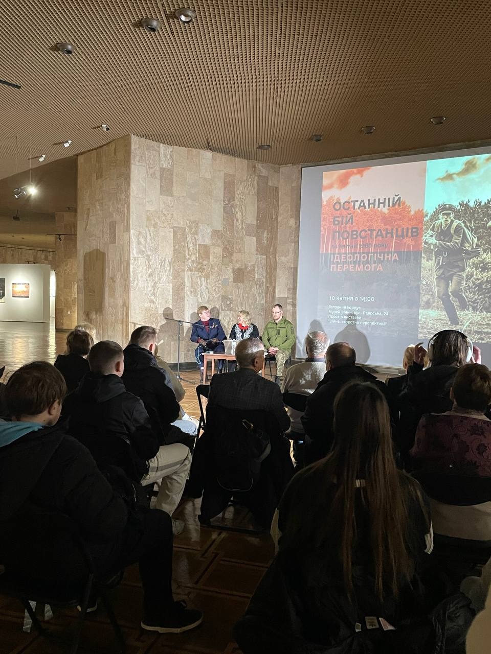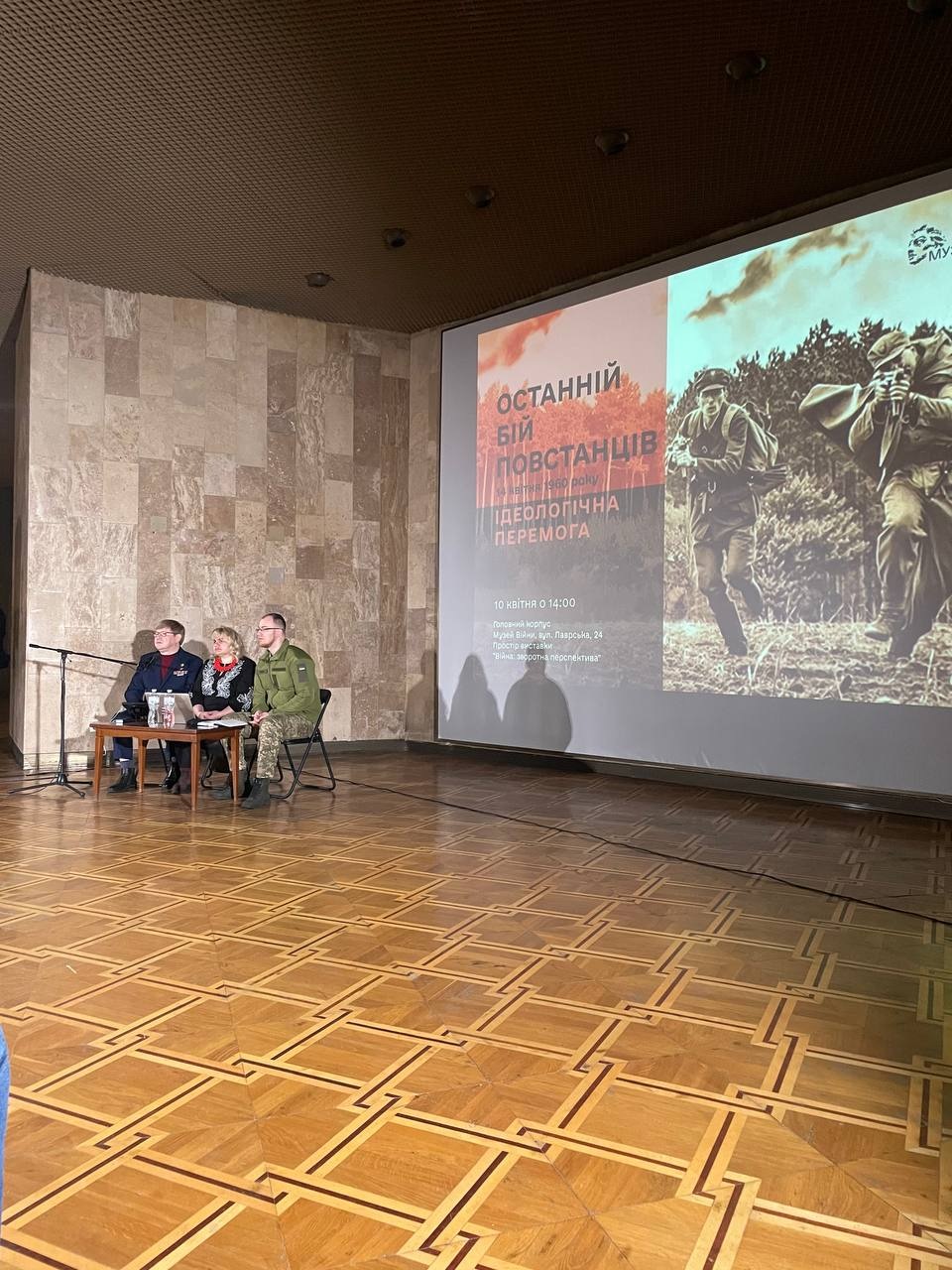 Студенти Навчально-науковий інститут управління, економіки та бізнесу МАУП 10 квітня долучилися до публічної лекції «Останній бій повстанців. Ідеологічна перемога», що відбулася 10 квітня 2025 р. о 14:00 у Головному корпусі Музею війни. Подія приурочена до 65-х роковин збройної сутички останньої боївки УПА з солдатами КГБ на Тернопільщині. Захід був покликаний висвітлити діяльність Української повстанської армії, її боротьбу за відновлення державності України та довготривалий опір радянському режиму. Історики Леся Онишко та Ігор Бігун окреслили основні віхи існування УПА, а також реконструювали хронологію останніх відомих боїв з радянськими спецслужбами в 1960-х роках, зокрема 14 квітня 1960 р.
