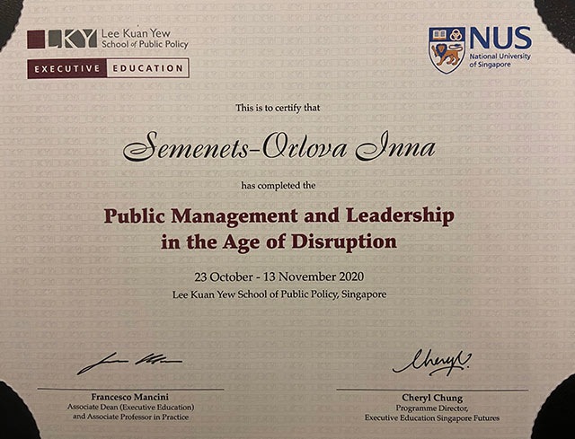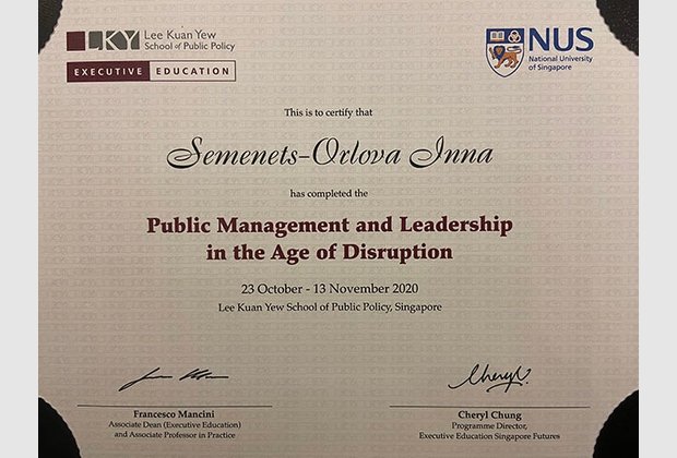 Вітаємо завідувача кафедри публічного адміністрування І. Семенець-Орлову та аспіранта кафедри 4 курсу Ю. Бережного із закінченням навчання у Національному університеті Сінгапуру за програмою "Державне управління та лідерство в епоху інновацій". В умовах пандемії навчання відбувалося у дистанційному форматі. Протягом жовтня-листопада слухачі вивчали унікальних досвід успішних реформ Сінгапуру разом з кращими лекторами Школи державної політики імені Лі Куан Ю - легендарного першого прем'єр-міністра Республіки Сінгапур, творця "сінгапурського економічного дива".