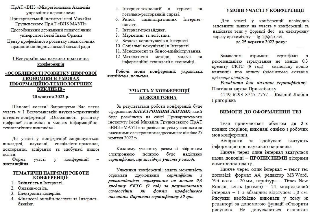 Шановні колеги! Запрошуємо Вас взяти участь у І Всеукраїнській науково-практичній інтернет-конференції «Особливості розвитку цифрової економіки в умовах інформаційно-технологічних викликів» 20 жовтня 2022 р.