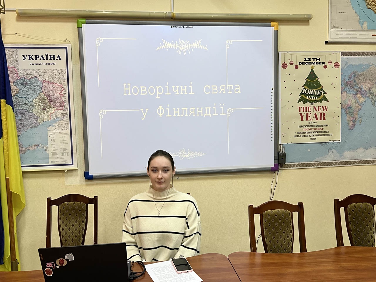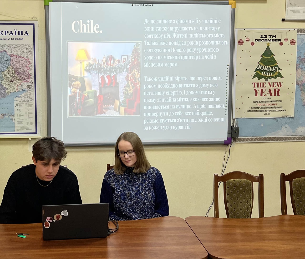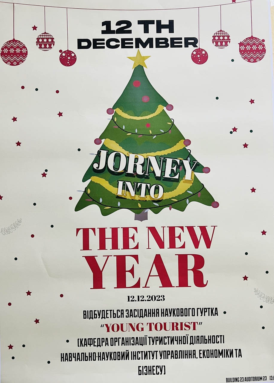 На передодні свята Нового року, 12 грудня 2023 року, відбулося засідання наукового гуртка “Young tourist” (кафедра організації туристичної діяльності, Навчально-науковий інститут управління, економіки та бізнесу) на тему: “Jorney into the New Year”. Студенти у своїх проєктах розглянули новорічні традиції, обряди місцевих жителів, страви, які є обовʼязковими елементами святкування Нового року в Німеччині, Китаї, Великобританії, Фінляндії, Естонії, Чилі та Філіппінах.