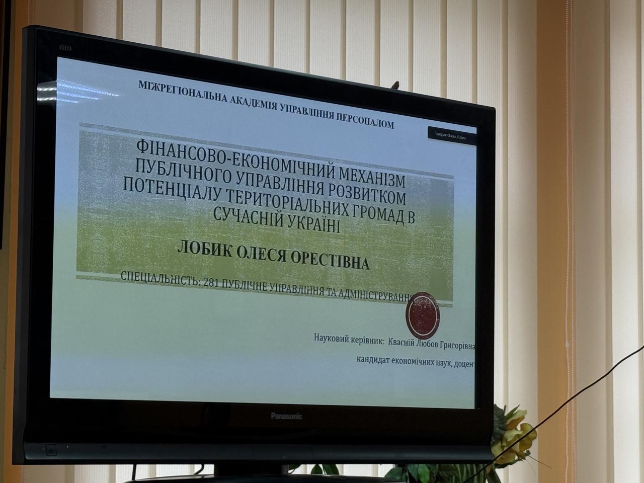 Тема дисертаційної роботи: «Фінансово-економічний механізм публічного управління розвитком потенціалу територіальних громад в сучасній Україні». Науковий керівник: кандидат економічних наук, доцент Квасній Любов Григорівна. Вітаємо щиро здобувачку та наукового керівника!