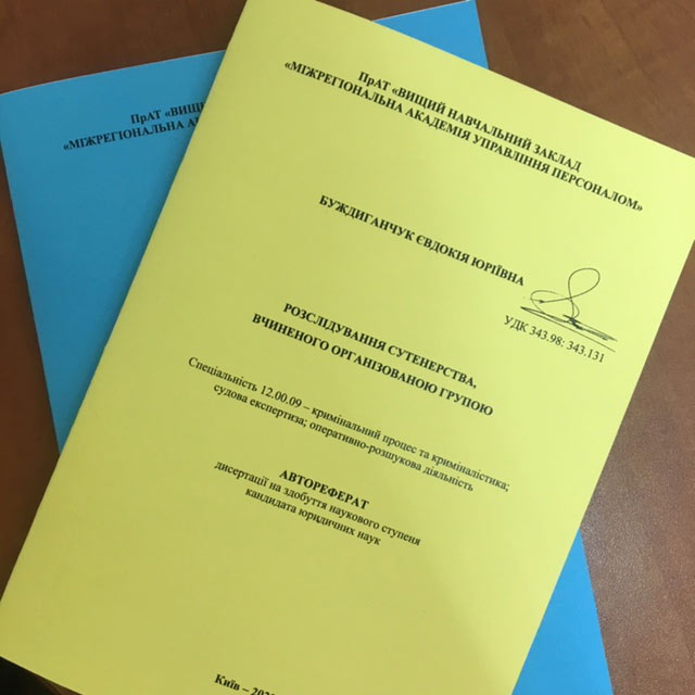 Буждиганчук Євдокія Юріївна 27 серпня 2020 року на засіданні спеціалізованої вченої ради в Міжрегіональній Академії управління персоналом, захистила дисертацію на здобуття наукового ступеня кандидата юридичних наук, за спеціальністю 12.00.09 – кримінальний процес та криміналістика; судова експертиза; оперативно-розшукова діяльність, на тему: «Розслідування сутенерства, вчиненого організованою групою».