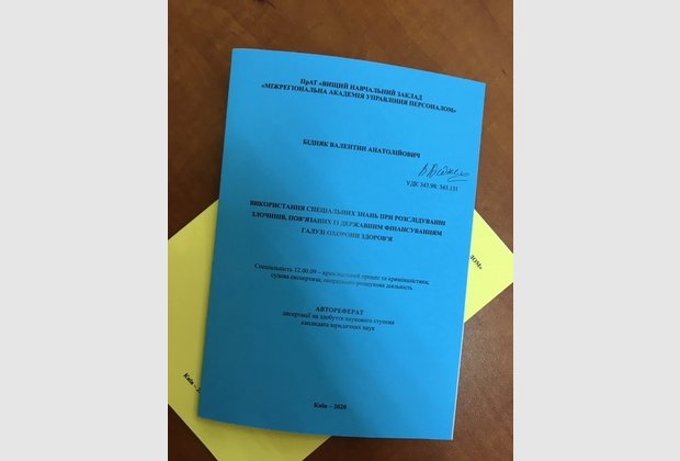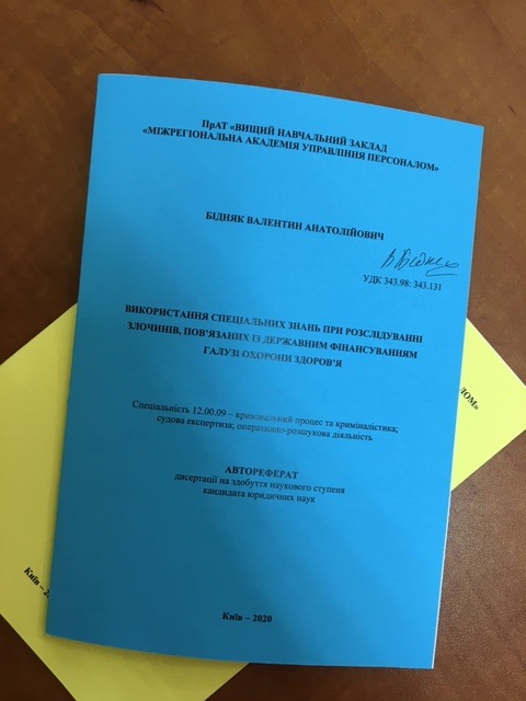 27 серпня 2020 року об 11.00 годині на засіданні спеціалізованої вченої ради в Міжрегіональній Академії управління персоналом відбувся захист дисертації Бідняка Валентина Анатолійовича на здобуття наукового ступеня кандидата юридичних наук на тему: «Використання спеціальних знань при розслідуванні злочинів, пов’язаних із державним фінансуванням галузі охорони здоров’я» за спеціальністю 12.00.09 – кримінальний процес та криміналістика; судова експертиза, оперативно-розшукова діяльність.
