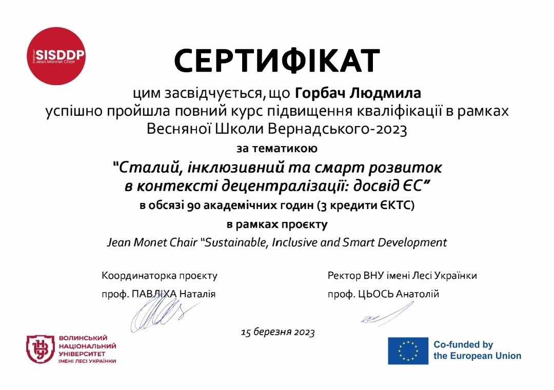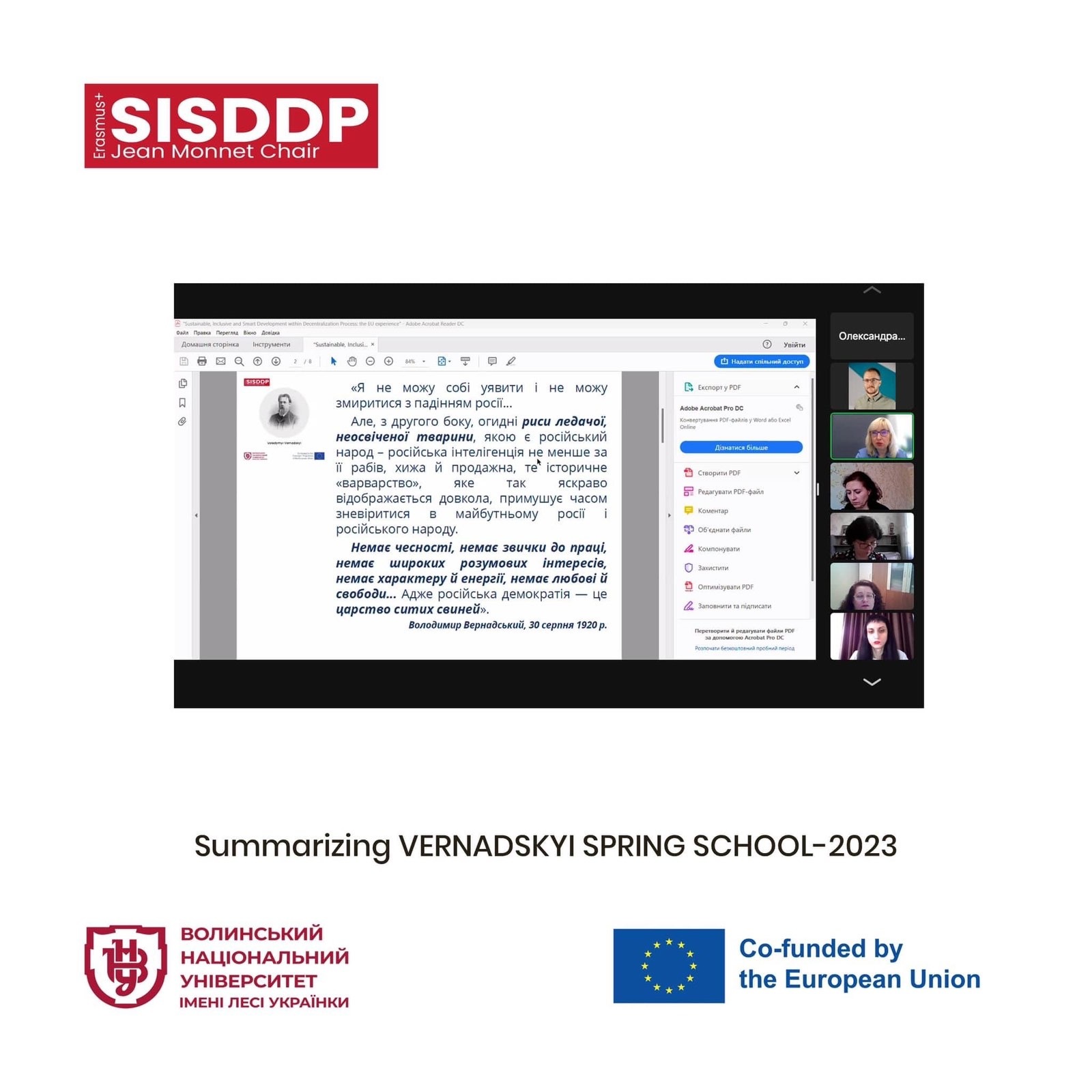 15 березня 2023 р. завершила роботу перша «ВЕСНЯНА ШКОЛА ВЕРНАДСЬКОГО-2023» в межах міжнародного гранту The Jean Monnet Chair project "Sustainable, Inclusive and Smart Development within Decentralization Process: the EU experience" Erasmus +.