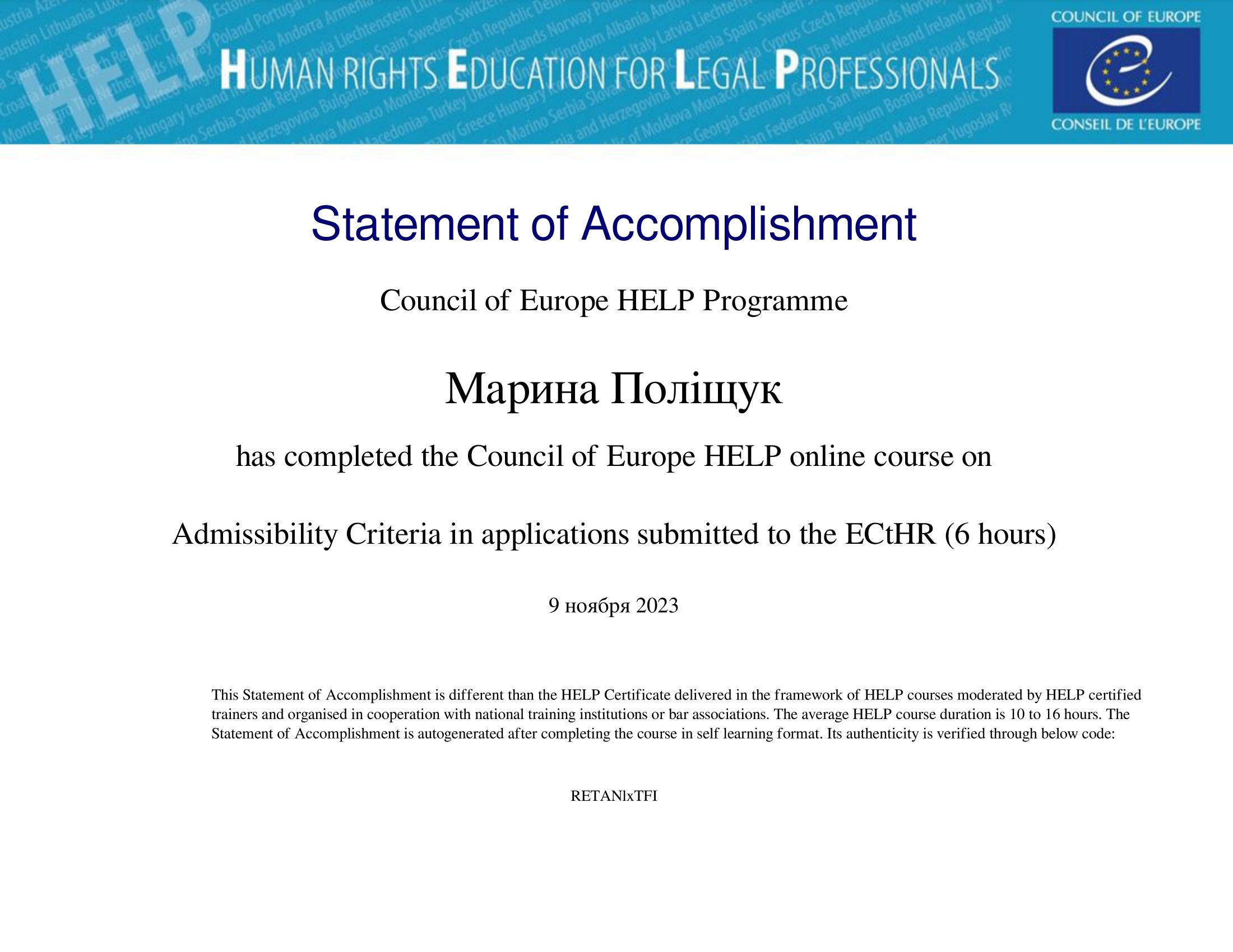 Прослухала курси за темами: "Рівний доступ жінок до правосуддя" - курс охоплює всебічний огляд міжнародних і європейських стандартів прав людини та гендерної рівності, судової практики та встановленої належної практики та "Право на індивідуальне звернення до Суду" - курс висвітлює відмінні риси та основні досягнення Європейської конвенції про захист прав людини. Отримала знання щодо стандартів і презендетної практики Європейського суду з прав людини.