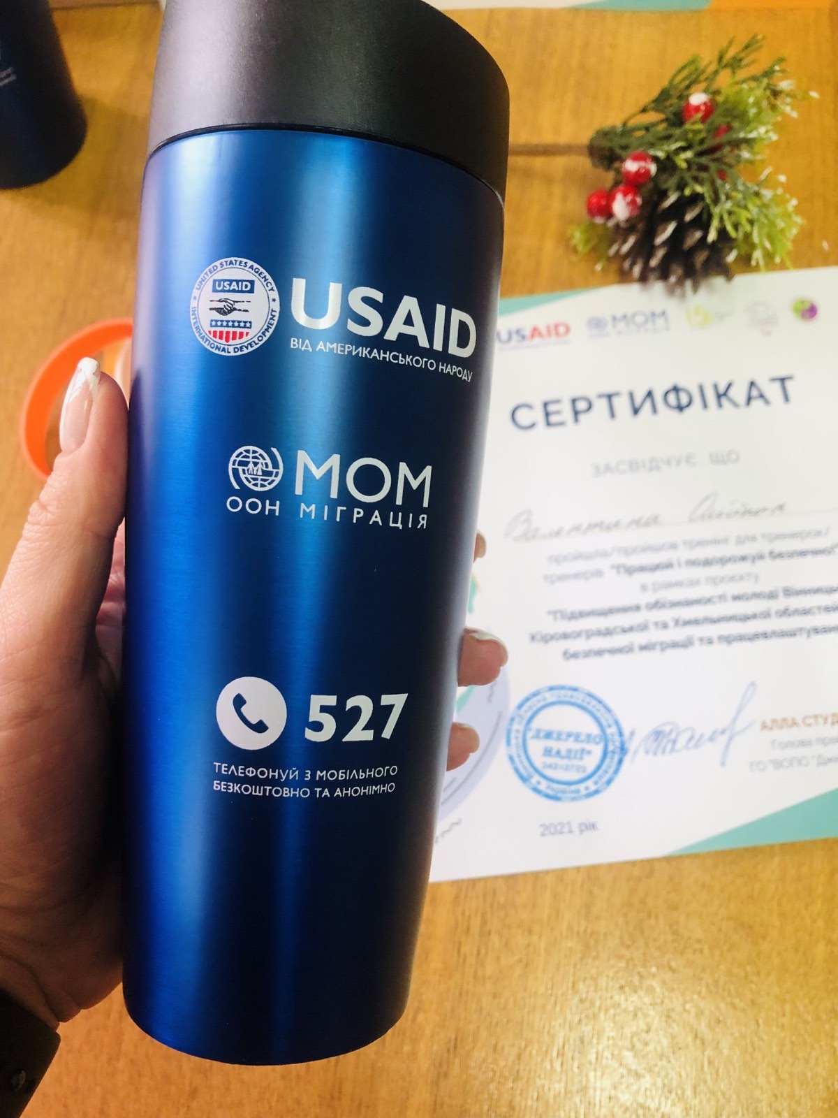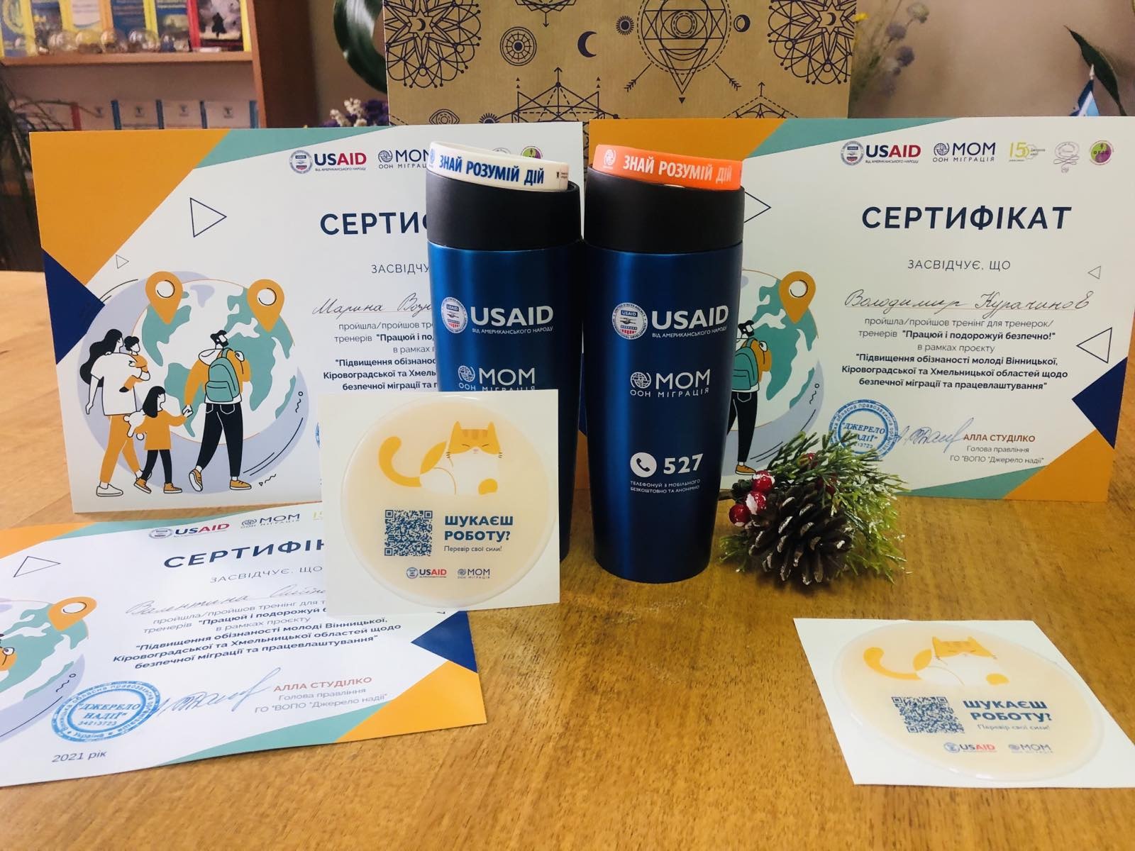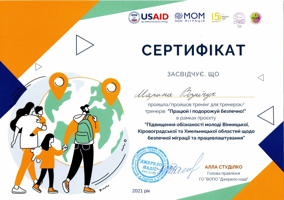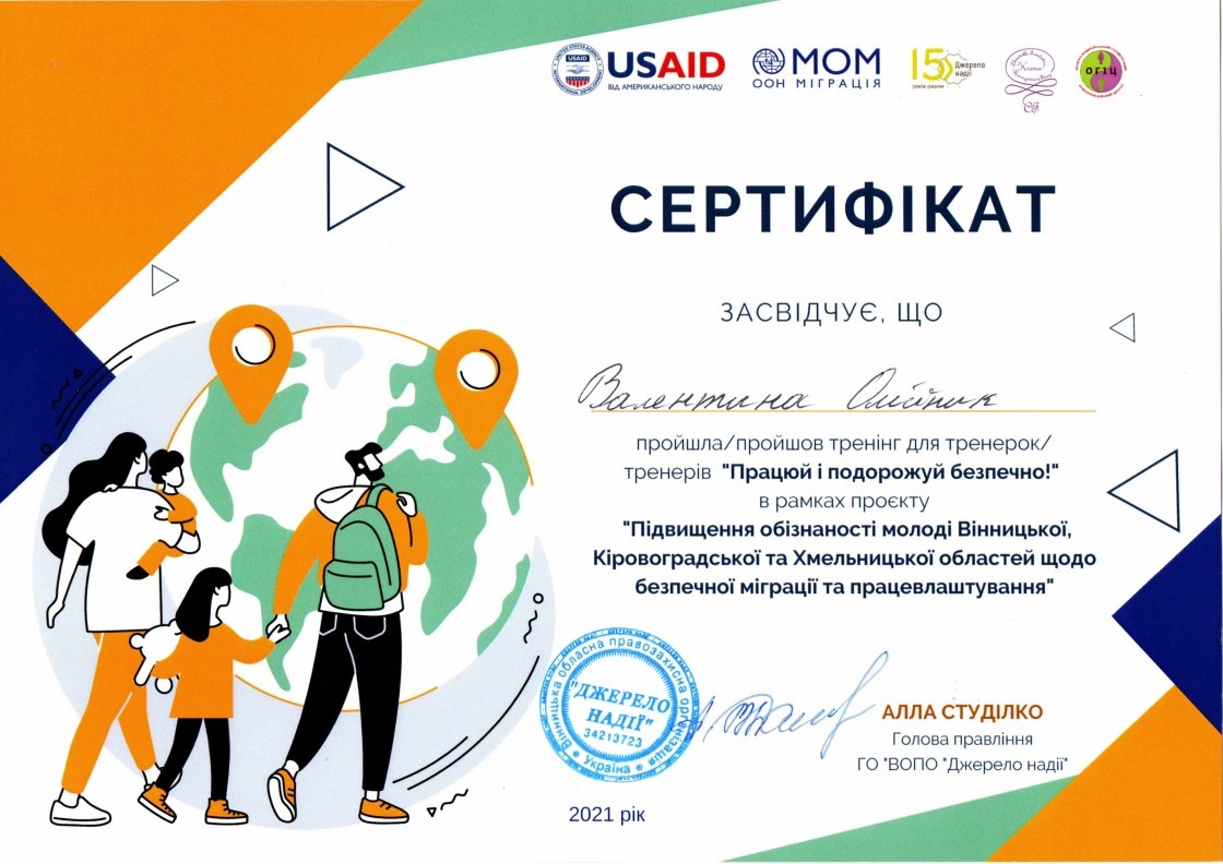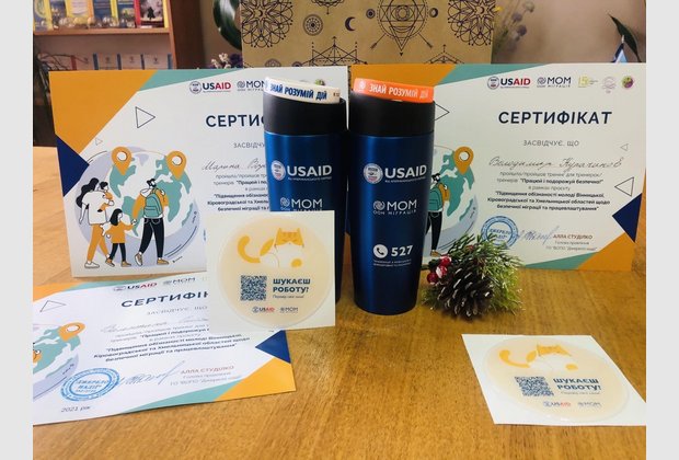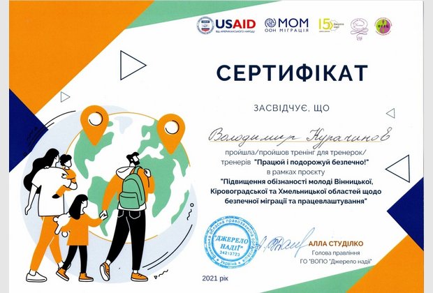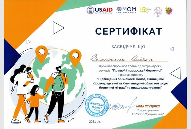 Усі учасники тренінгу отримали сертифікати тренерів в рамках проєкту «Підвищення обізнаності молоді Вінницької, Кіровоградської та Хмельницької областей щодо безпечної міграції та працевлаштування».