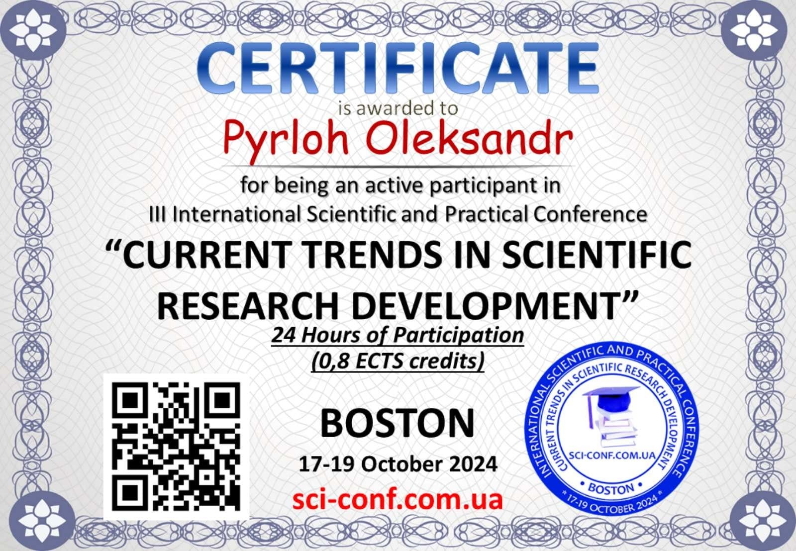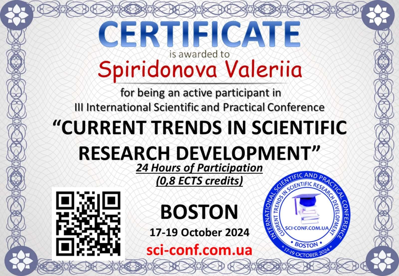 У жовтні 2024 року здобувачі вищої освіти 4 курсу кафедри економіки та менеджменту Придунайської філії ПрАТ "ВНЗ "МАУП" взяли участь у міжнародних науково-практичних конференціях: "Scientific achievements of contemporary society" та "Current trends in scientific research development" в онлайн режимі.