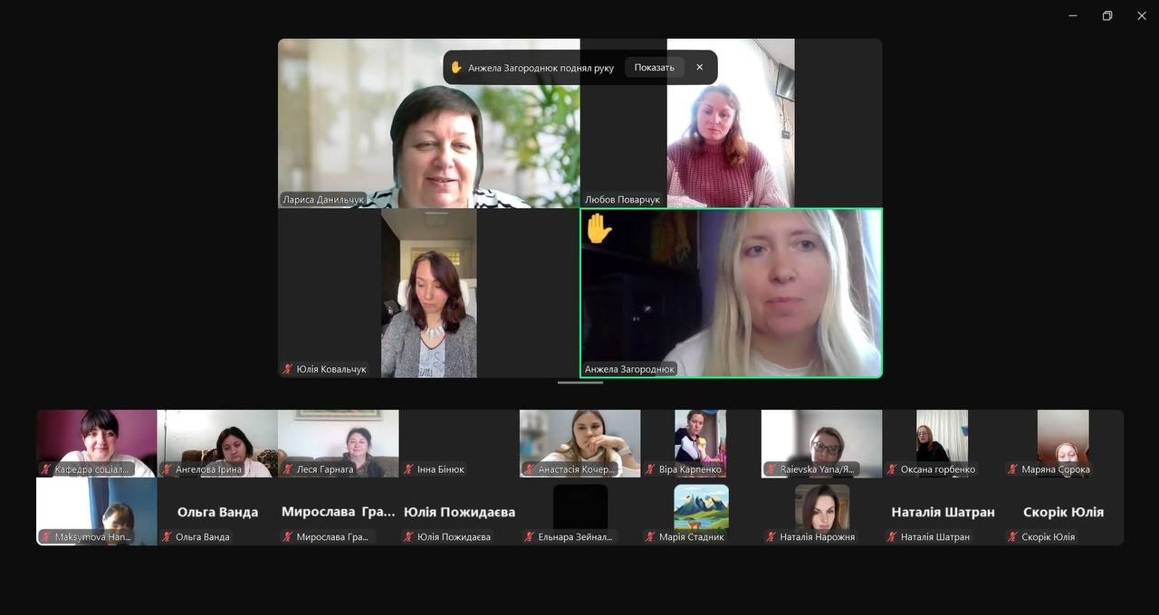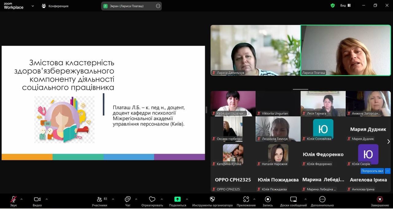 У якості спікерів виступили провідні спеціалісти з психології та соціальних наук: кандидат педагогічних наук, доцент кафедри психології Лариса Платаш, а також здобувачки освітніх рівнів спеціальності «Психологія» Ірина Ільясова та Юлія Ковальчук. Їхні виступи торкалися важливих питань, що охоплювали як теоретичні, так і практичні аспекти збереження здоров’я в умовах стресової соціальної роботи.
