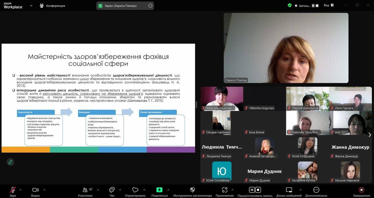- Змістове структурування здоров’язбережувального компонента в діяльності соціальних працівників. Спікери наголошували на важливості інтеграції елементів здоров’язбереження у повсякденну роботу з метою зниження рівня професійного вигорання.